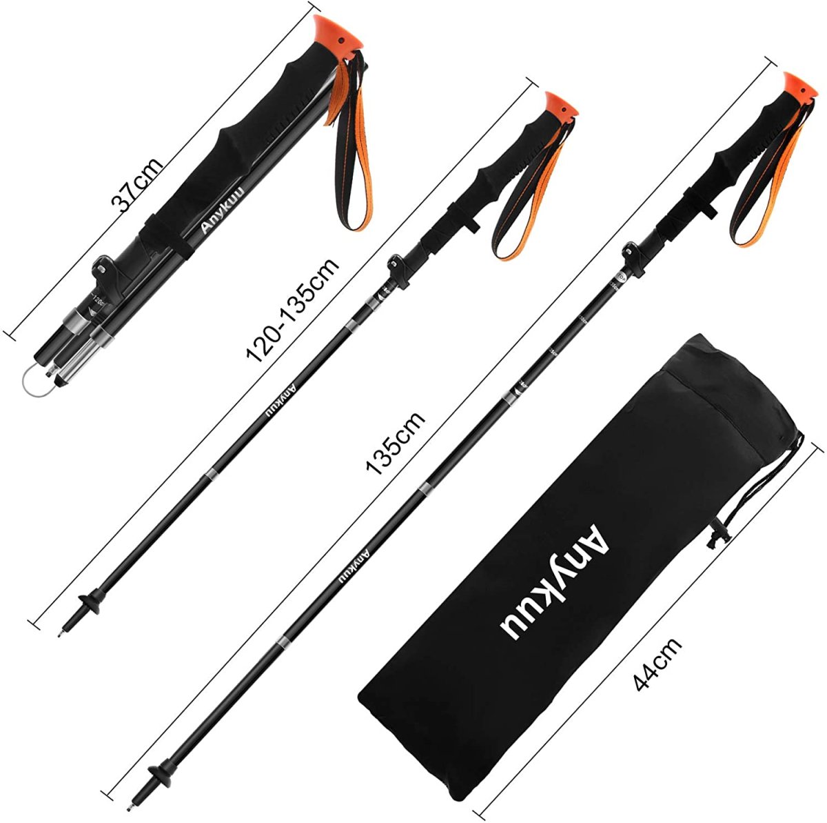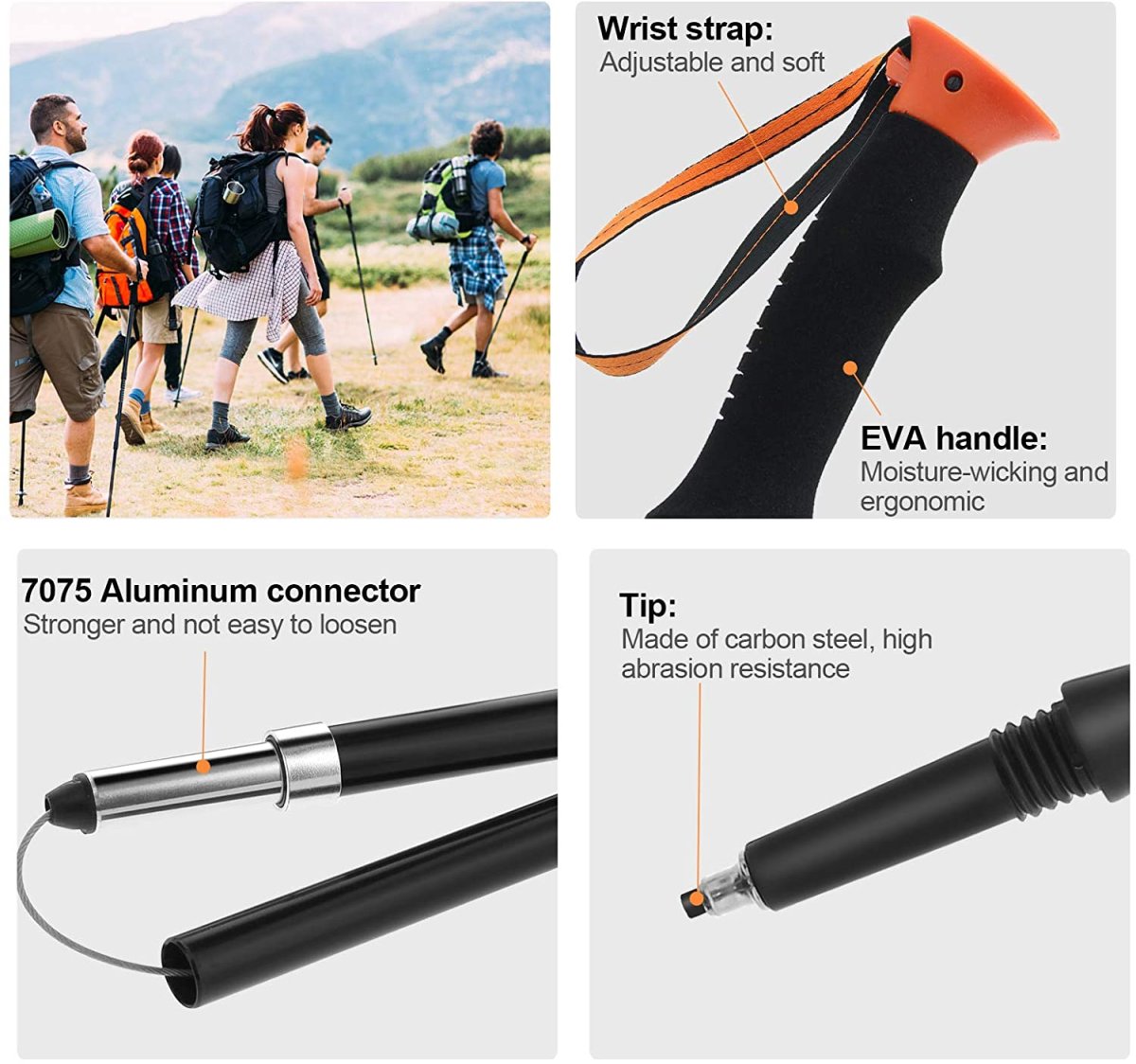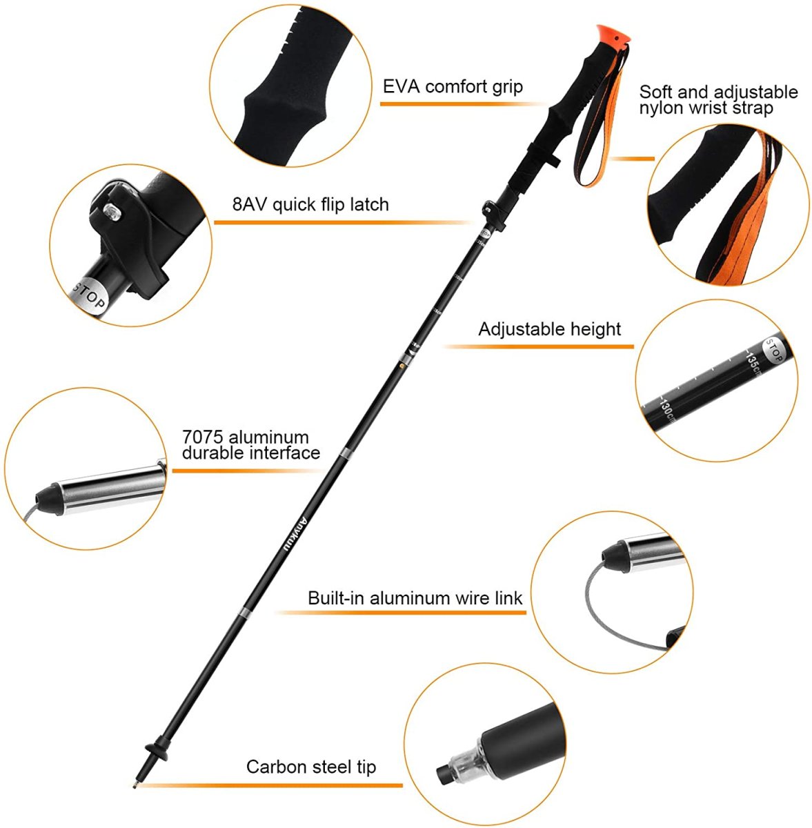 Los bastones de trekking están hechos de fibra de carbono y aluminio 7075, que son ligeros y duraderos. Se puede doblar en 3 partes y poner en la mochila. La longitud doblada es de 37 cm y el peso individual es de solo 0,89 kg, lo que es muy cómodo de llevar. La combinación de colores negro y naranja diseñada por diseñadores profesionales hace que su bastón de trekking sea único.