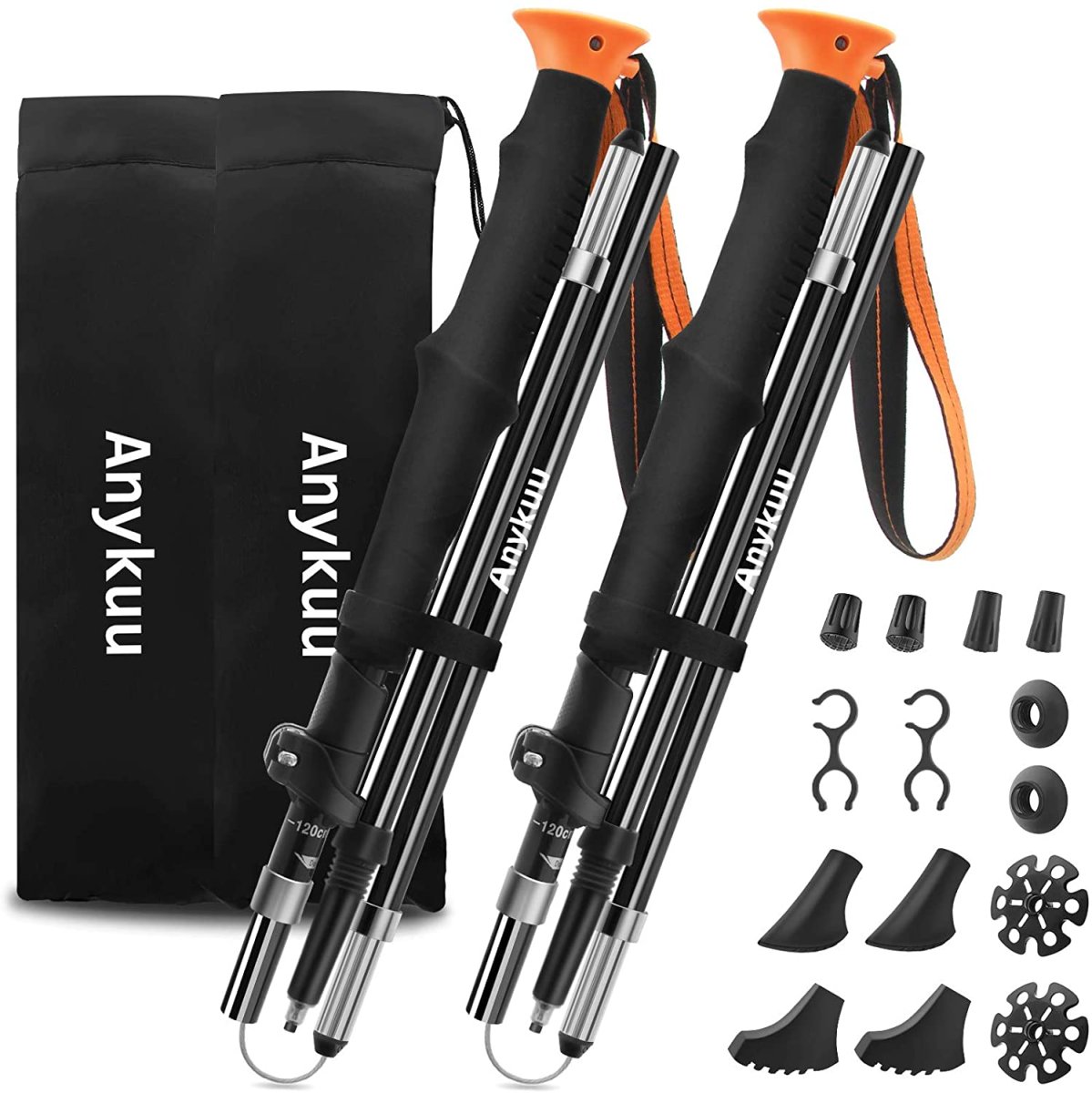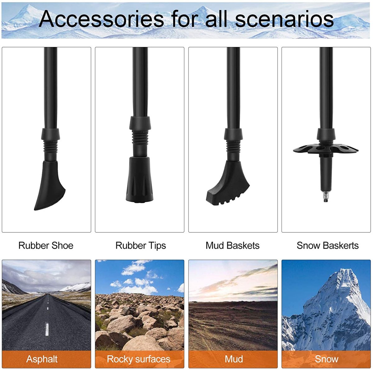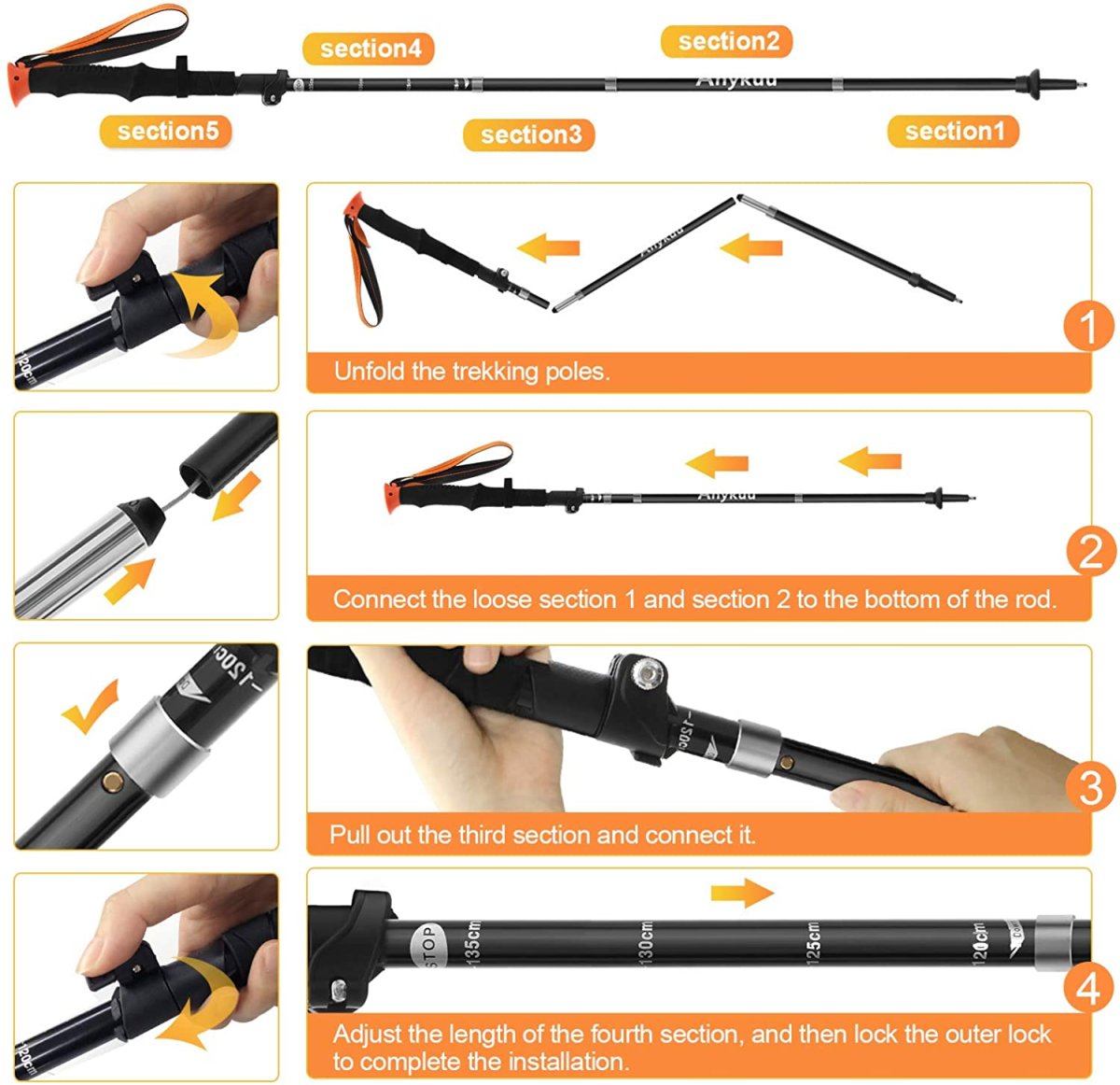 Los bastones de trekking están hechos de fibra de carbono y aluminio 7075, que son ligeros y duraderos. Se puede doblar en 3 partes y poner en la mochila. La longitud doblada es de 37 cm y el peso individual es de solo 0,89 kg, lo que es muy cómodo de llevar. La combinación de colores negro y naranja diseñada por diseñadores profesionales hace que su bastón de trekking sea único.