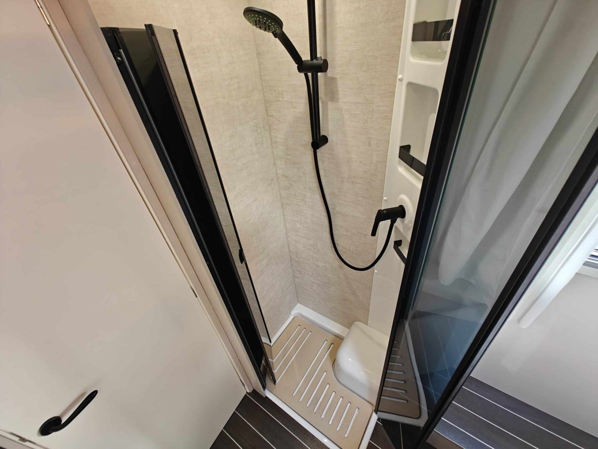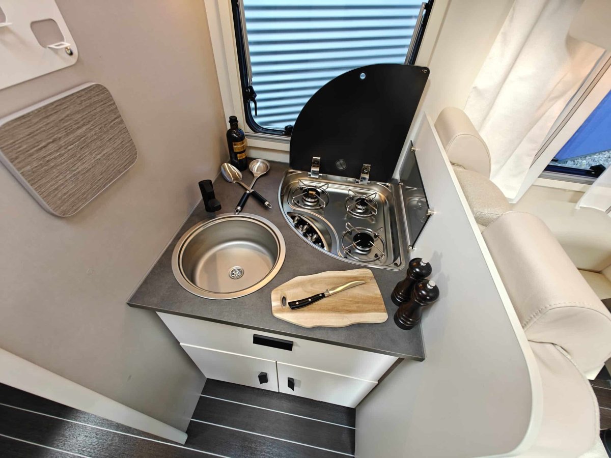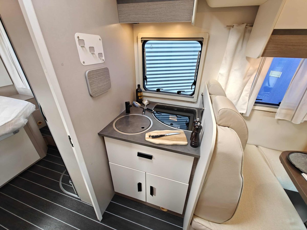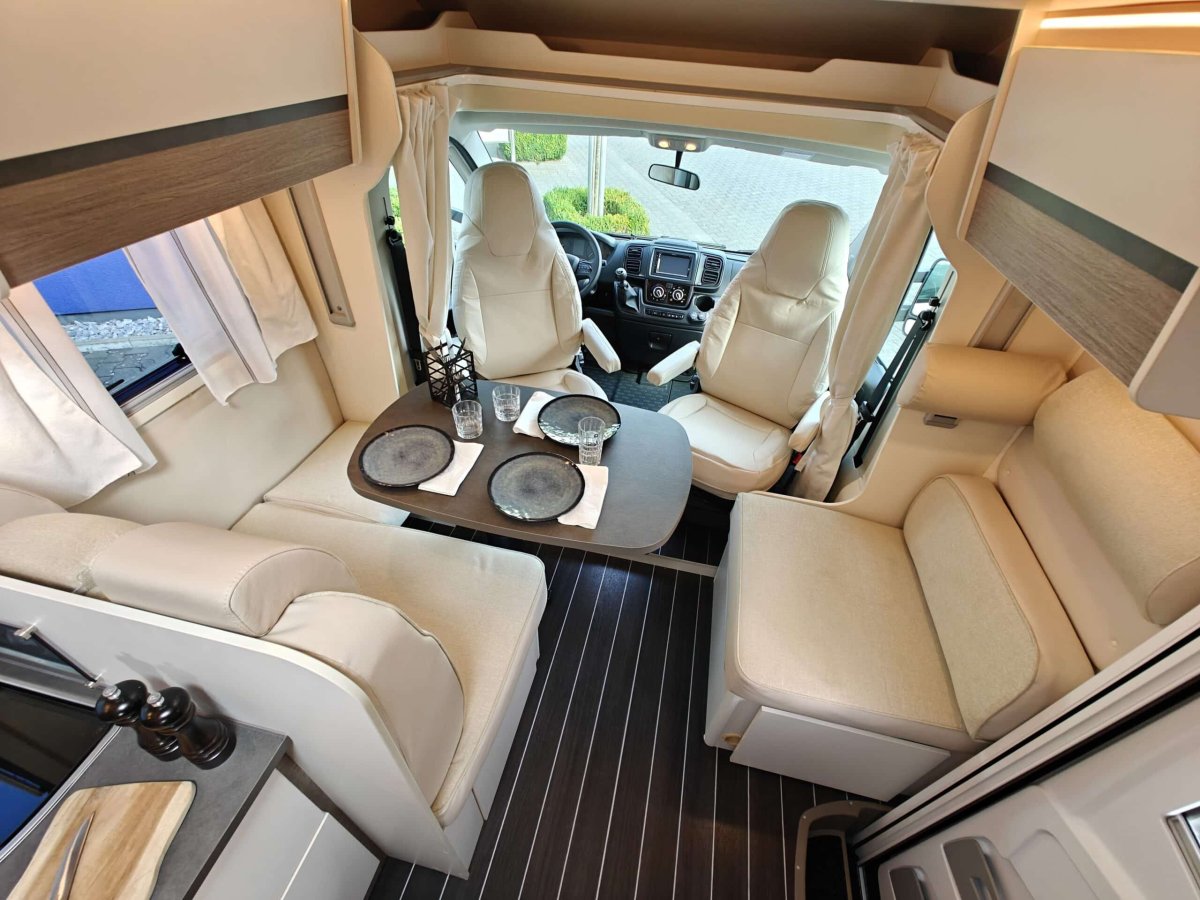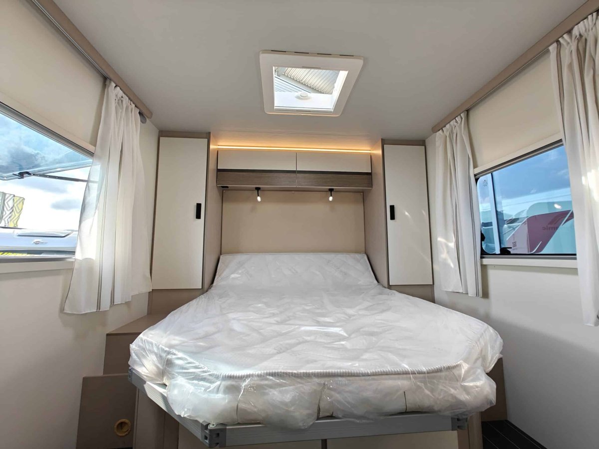 Distribución de Camas: Cama principal tipo isla (accesible desde ambos lados) en la parte trasera, con armarios roperos y altillos. Además, cuenta con una cama basculante sobre el comedor y la posibilidad de montar una tercera cama individual supletoria en el salón.