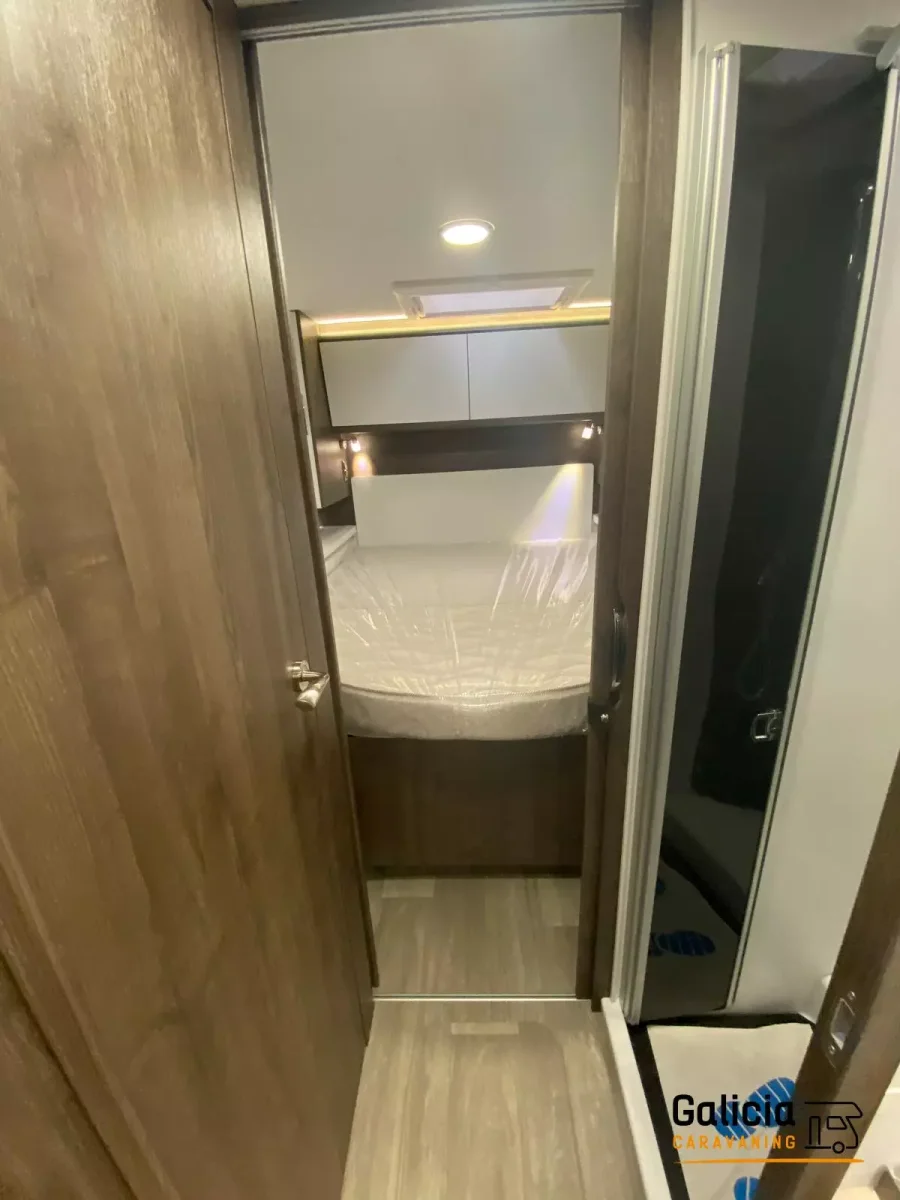 Autocaravana perfilada Benimar Tessoro 497 AUTOMÁTICA con cama isla y cama basculante doble. Salón face to face. Baño separado y doble puerta de separación.