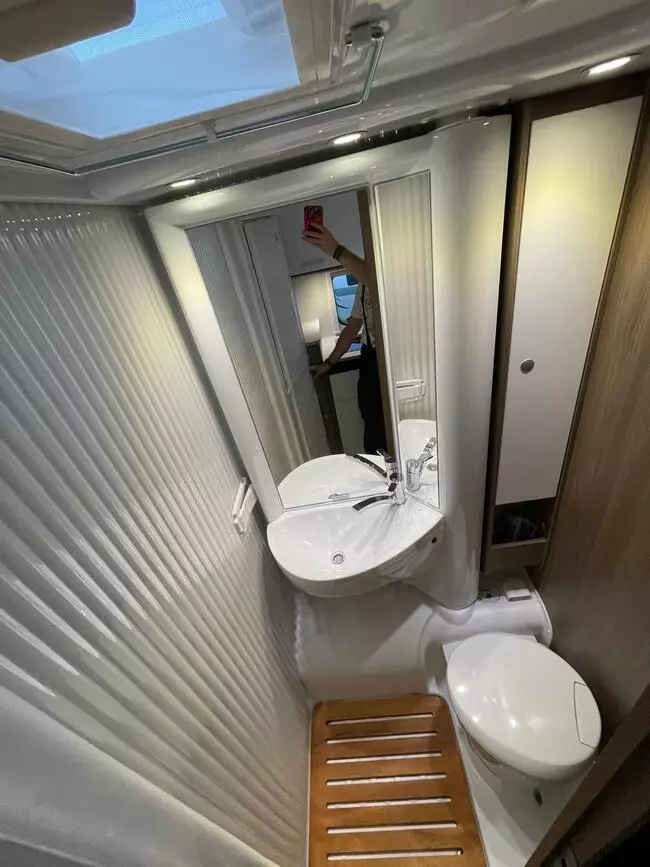 El baño Vario tiene un gran espejo y numerosos compartimentos en los que se pueden guardar todos los utensilios de lavado. Con unos sencillos pasos la zona de lavado se convierte en una ducha.