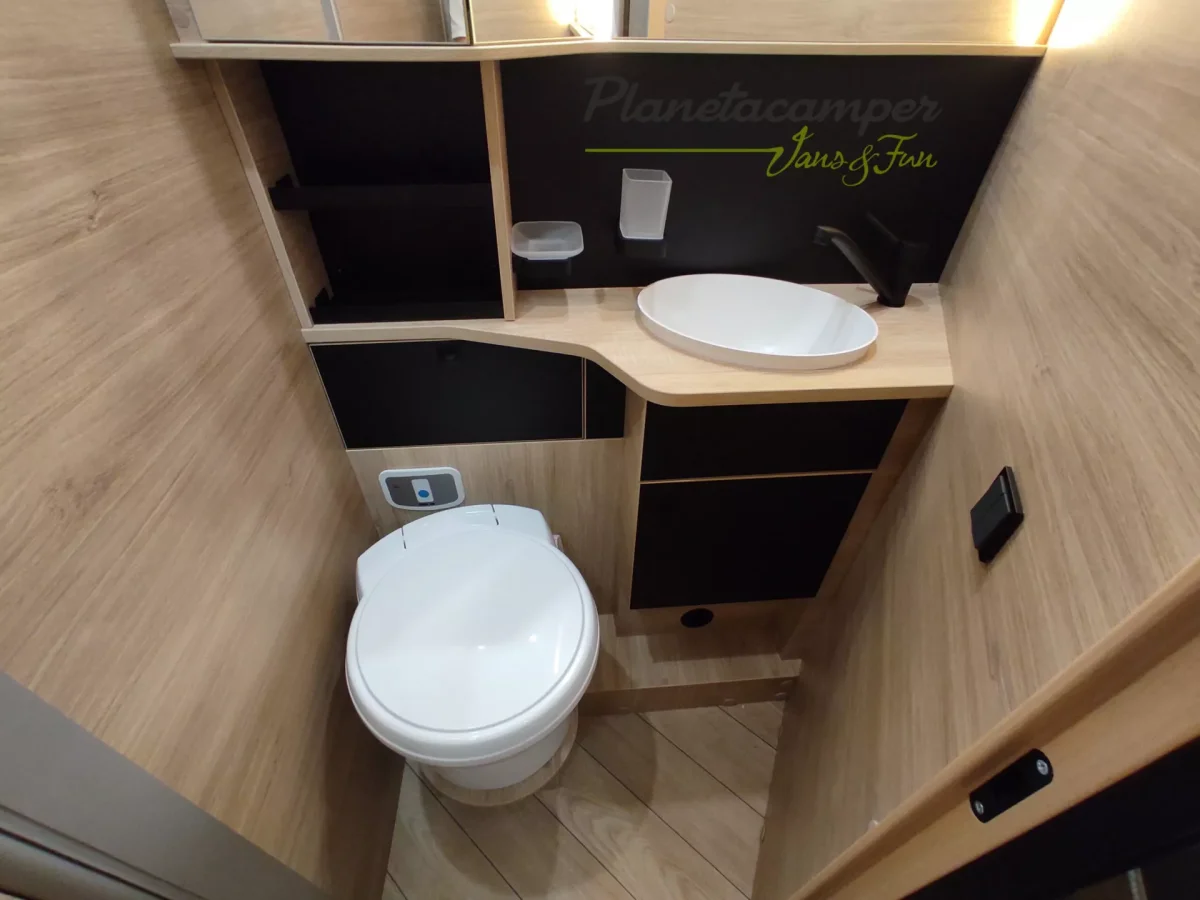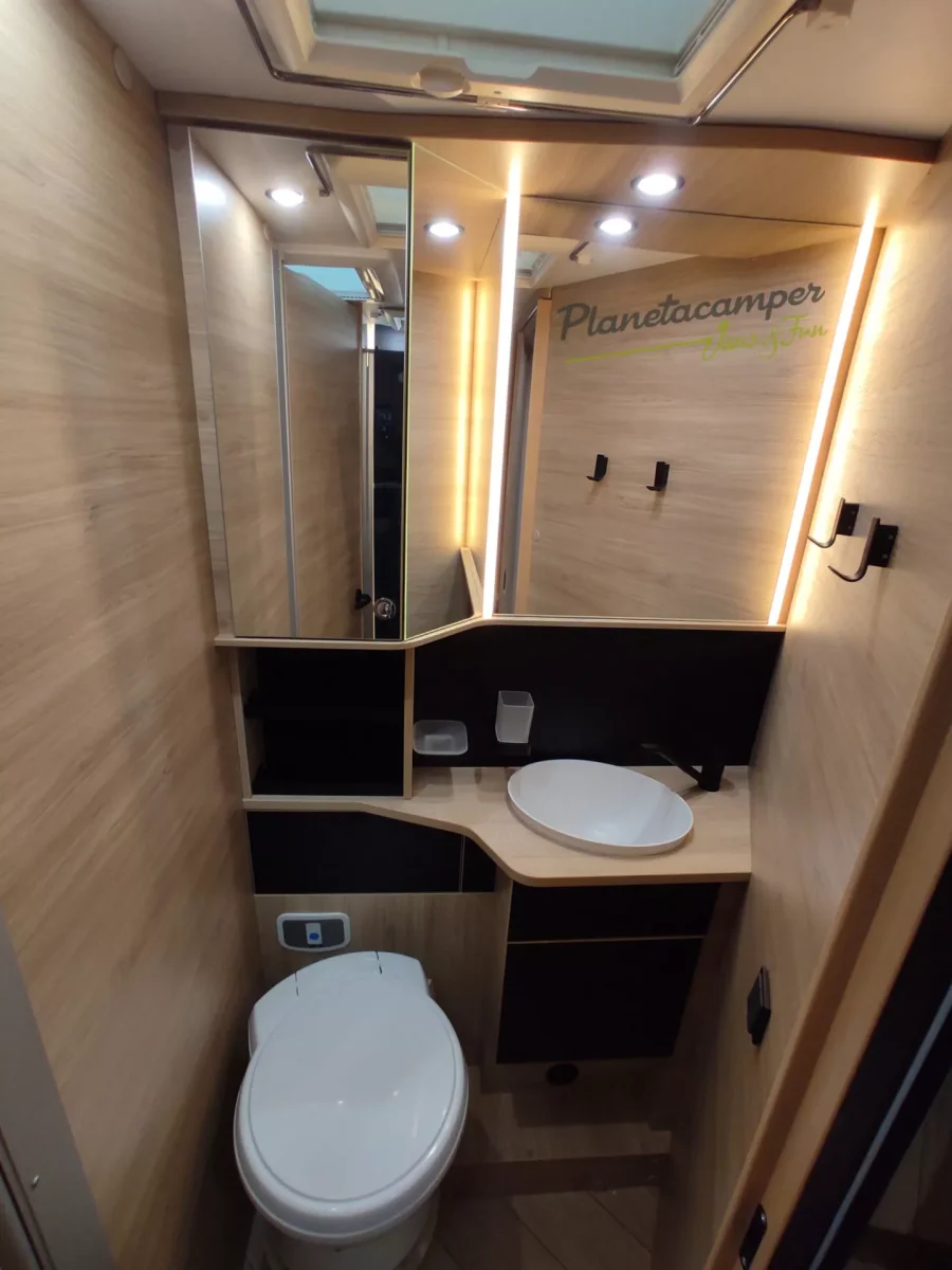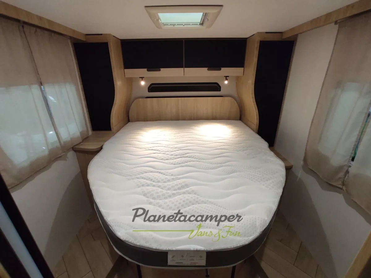 El perfilado 318 destaca por su distribución generosa y su atención al detalle. Su salón face-to-face crea un espacio realmente acogedor, ideal para compartir buenos momentos en pareja o con amigos. En la parte trasera, la cama central de 160 cm garantiza un descanso de alta gama, completada por un baño con doble tabique que asegura privacidad y fluidez de circulación. Un perfilado pensado para quienes desean viajar sin renunciar ni al bienestar ni al espacio.