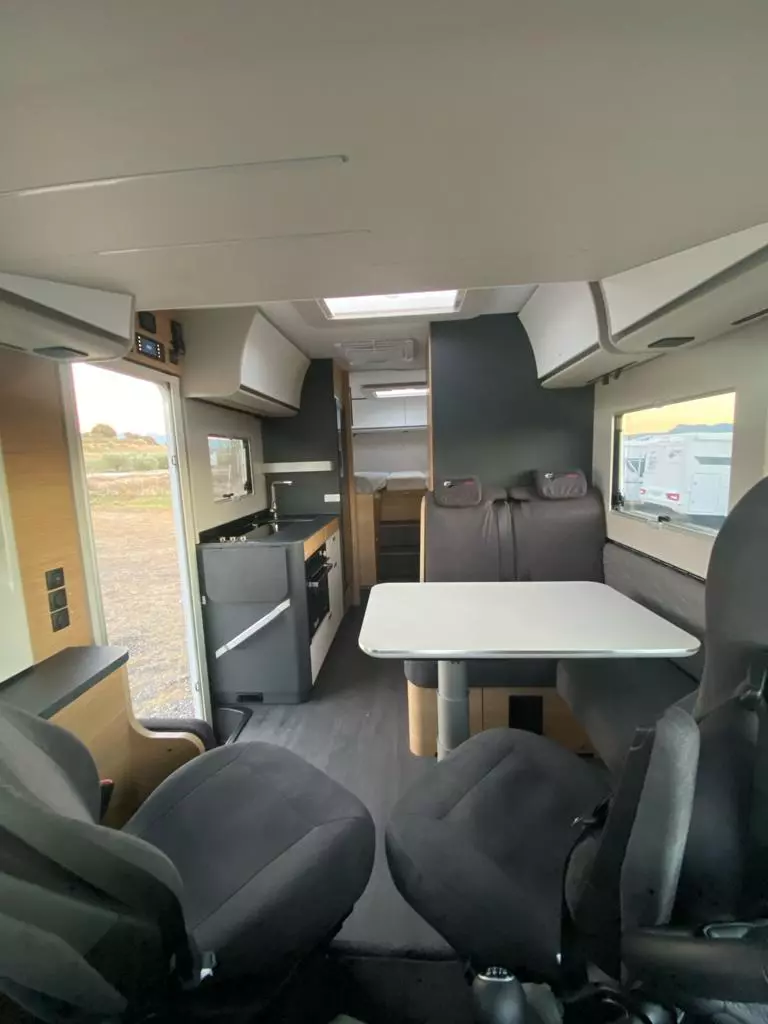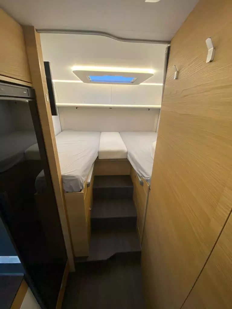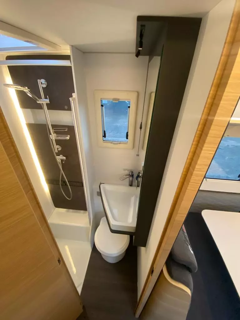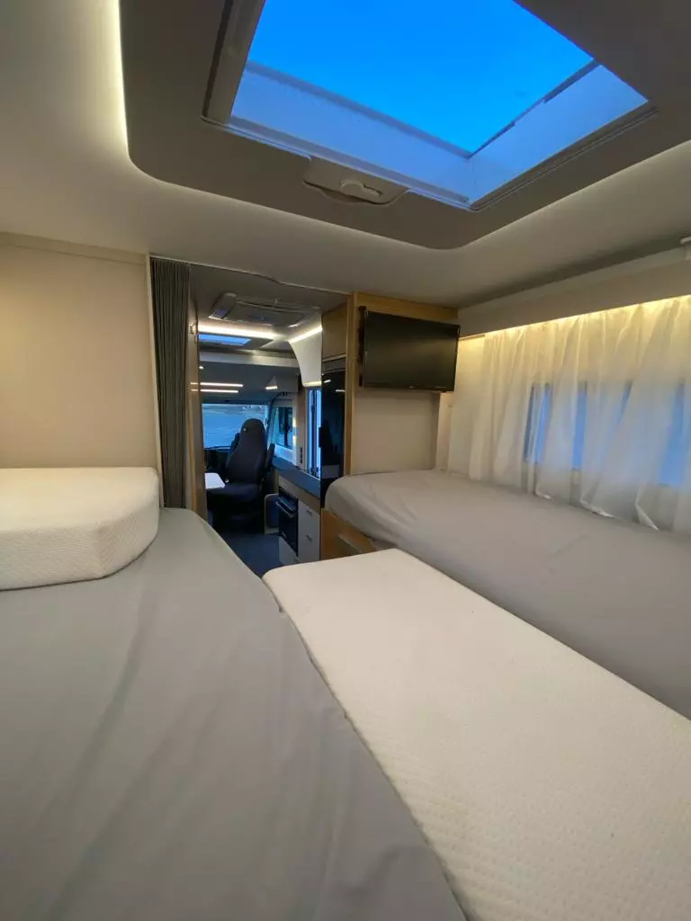Además, tienes un cuarto de baño con plato de ducha; salón de 4 plazas con asientos de cabina giratorios; 1 televisión, armarios roperos, espacioso garaje con altura regulable y toldo exterior.