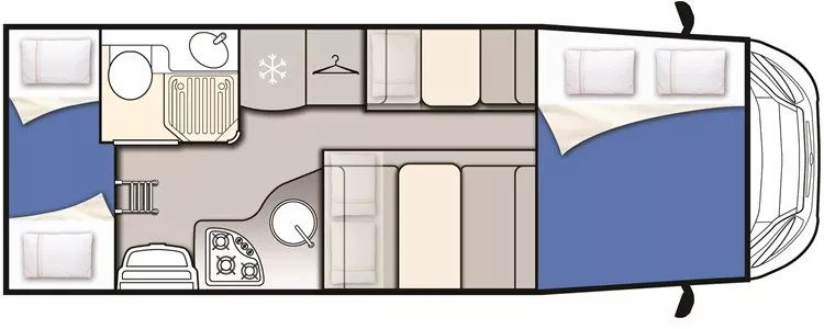 La autocaravana capuchina Elnagh Baron 22 es un amplio modelo familiar de 7 plazas para viajar y para dormir. Tienes dos literas traseras de 90×220 cm, una cama capuchina de 160×220 cm, un salón convertible en cama doble de 130×180 cm y una cama para un niño de 70×150 cm. Esta autocaravana de 7 metros de largo es amplia por dentro y compacta por fuera, facilitando su conducción y acostumbrándonos en pocos minutos a su tamaño.