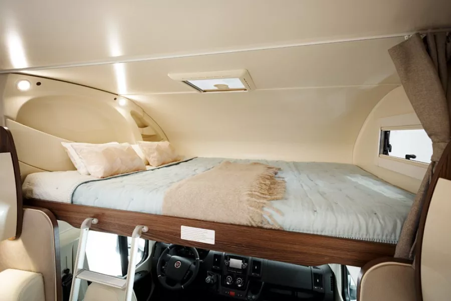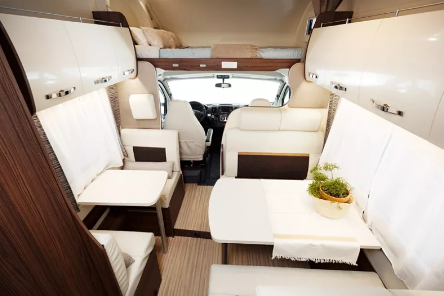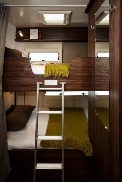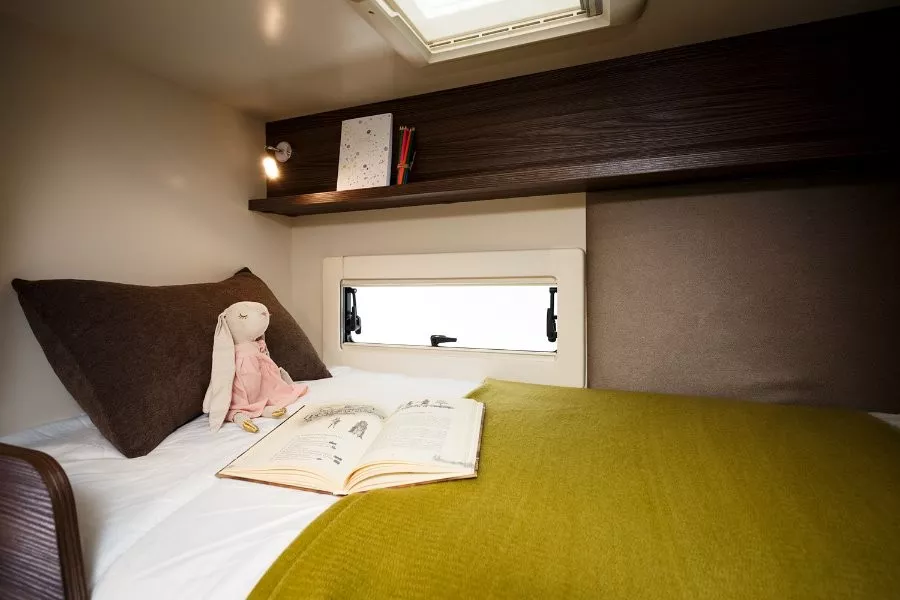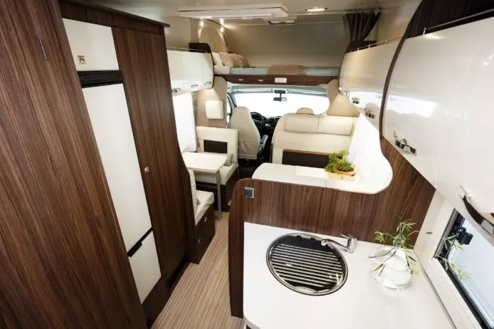 La autocaravana Benimar Sport 323 es un modelo familiar con menos de 7 metros de largo que te proporciona amplio y confortable habitáculo y 6 plazas en circulación y para dormir. En la parte posterior del vehículo están dos camas literas de 82×210 cm cada una. La gran cama matrimonial sobre cabina tiene unas dimensiones de 155×205 cm. En la parte central del habitáculo los sofás del salón se transforman en una cama doble de 130×180 cm.