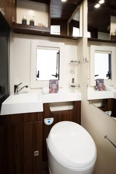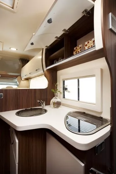 La mesa del comedor se amplia, la nevera tiene capacidad de 140l y un cajón independiente para 9 botellas de 1,5l. El plato de ducha en la autocaravana Benimar Sport 323 es independiente del cuarto de baño y tiene una ventana. En la cocina encontrarás tres fuegos encastrados, fregadero y múltiples armarios.