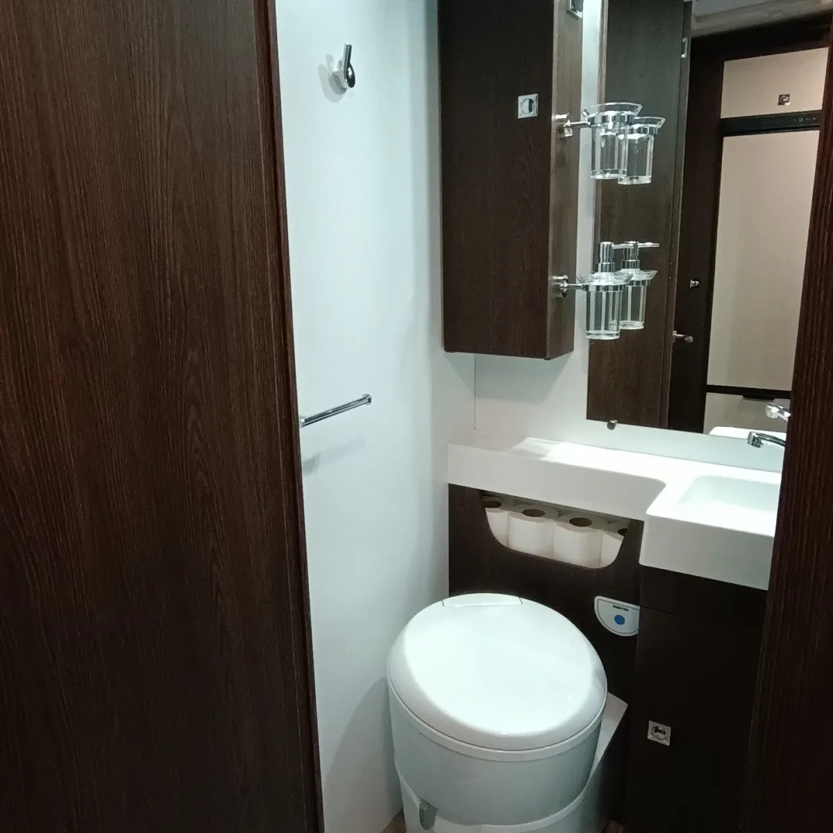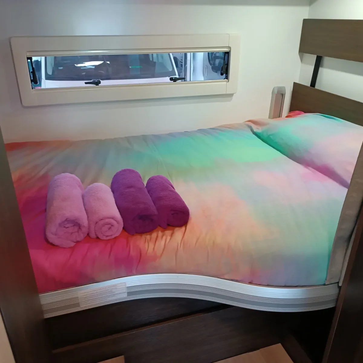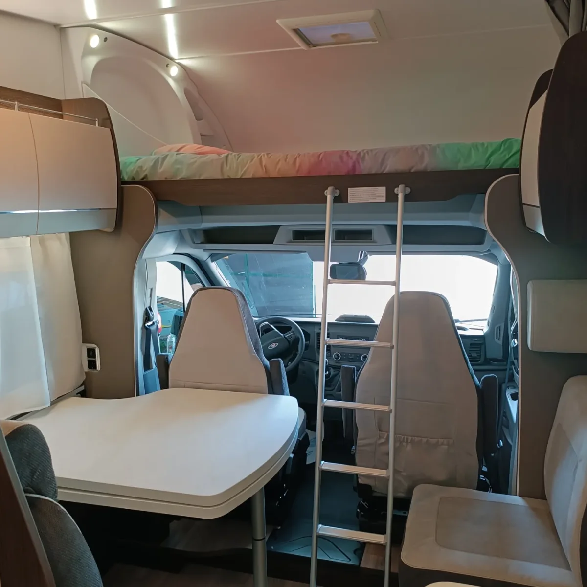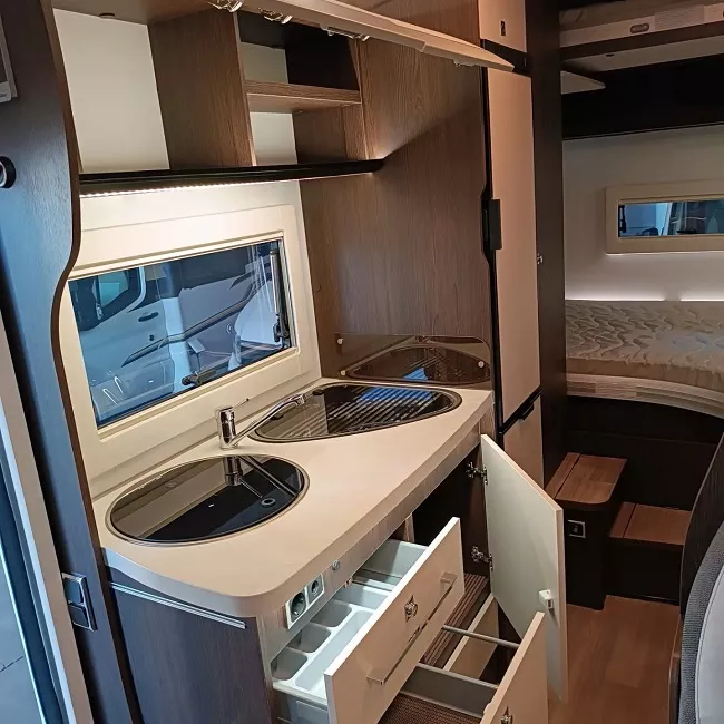 El mobiliario está diseñado para un total aprovechamiento del espacio. Un ambiente interior amplio y a la vez acogedor, mesa central de altura regulable en el salón y una gran luminosidad gracias a la cantidad de ventanas y de las claraboyas situadas en el techo.