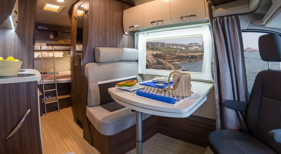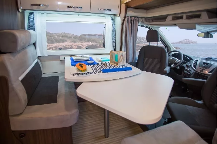 En el comedor dispones de dos sofás, asientos giratorios del conductor y copiloto y una gran mesa que se puede alargar.