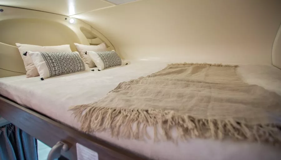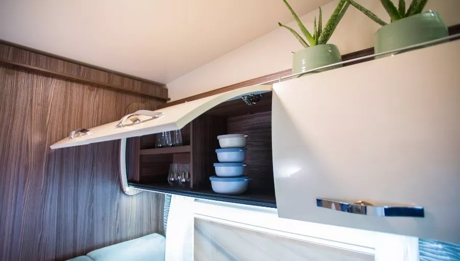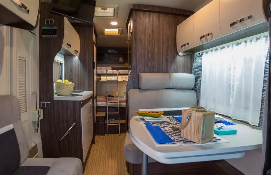 La autocaravana Benimar Sport 340 UP es una capuchina de menos de 7 metros de largo ideal para familias con niños o grupos de amigos. Este modelo te ofrece hasta 5 plazas para viajar y 5 para dormir. La distribución de las camas es la siguiente: en la parte posterior del habitáculo se encuentra una cama doble transversal (130×205 cm) y encima de ella una litera suspendida del techo de 80×190 cm. Sobre la cabina hay otra cama doble de 155×205 cm.