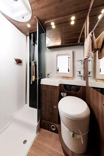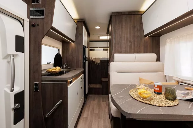 Aparte, el equipamiento de esta autocaravana incluye un cuarto de aseo con ducha separada, agua caliente, calefacción, cocina completa con gran frigorífico de 150l con congelador independiente, amplio salón con mesa central extensible, muchos espacios para guardar las cosas, entre ellos, un gran garaje con doble portón y altura interior máxima de 120 cm.