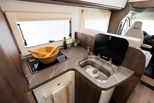 Autocaravana capuchina Benimar Sport 363 con camas gemelas en la parte trasera, cama capuchina y salón convertible para 5 personas viajar y dormir. Baño y ducha separados.