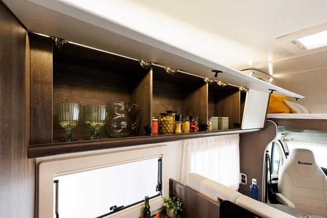 La autocaravana capuchina Benimar Sport 346 es un amplio y confortable vehículo con 5 asientos homologados para viajar y 5 plazas para dormir. Este modelo te ofrece dos camas dobles: Camas gemelas transformables en cama doble de 170×210 cm y Cama capuchina de 155 cm