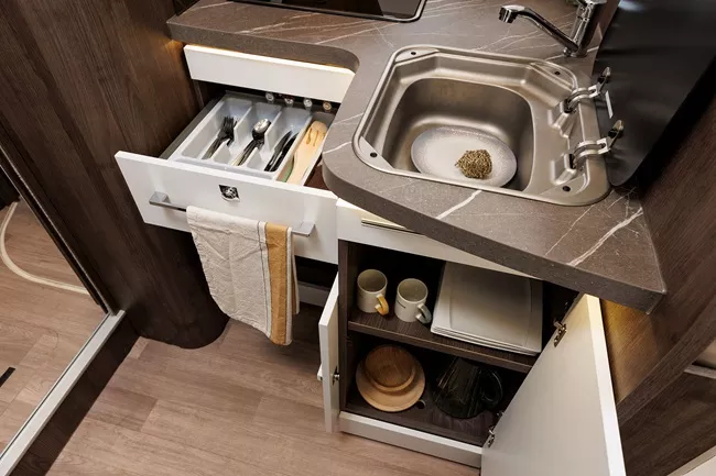Aparte, el equipamiento de esta autocaravana incluye un cuarto de aseo con ducha separada, agua caliente, calefacción, cocina completa con gran frigorífico de 140l con congelador independiente, amplio salón con mesa central extensible, muchos espacios para guardar las cosas, entre ellos, un gran garaje con doble portón y altura interior máxima de 113cm.