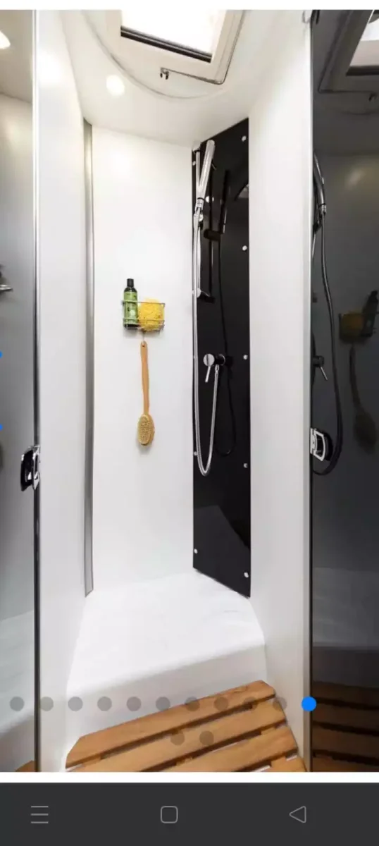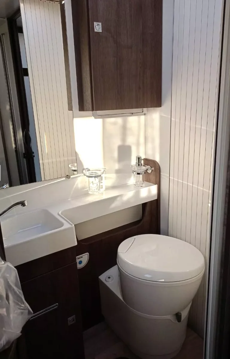 Además, tienes un cuarto de baño con plato de ducha; cocina con nevera y congelador; salón de 5 plazas con asientos de cabina giratorios; televisión, armarios y toldo exterior.