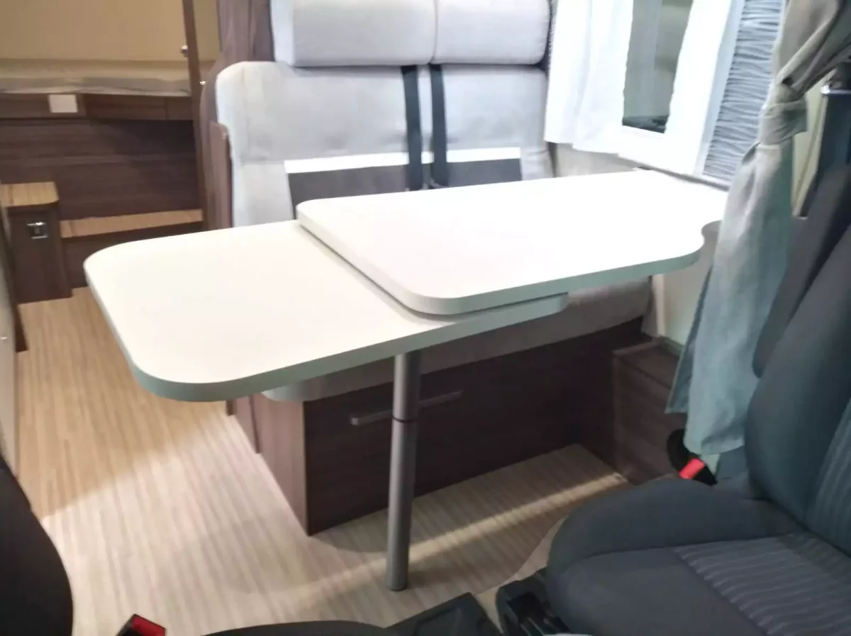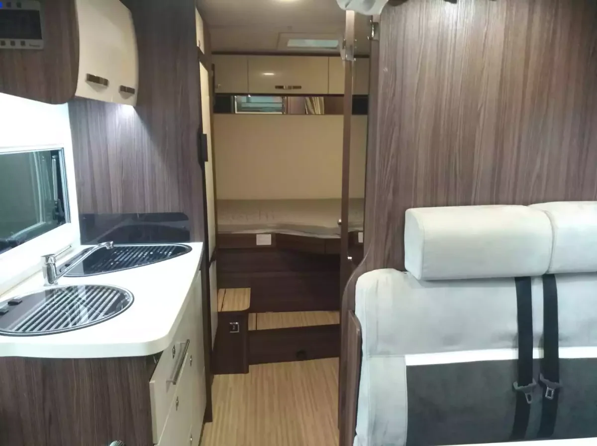 Autocaravana perfilada Benimar Tessoro 440 UP es un modelo con tres plazas para dormir. Dispones de una cama doble transversal de 131/190×203 cm en la parte posterior que se puede regular en altura y otra individual suspendida de techo de 74×191 cm en la parte central. Es un modelo compacto con tan sólo 634 cm de largo.