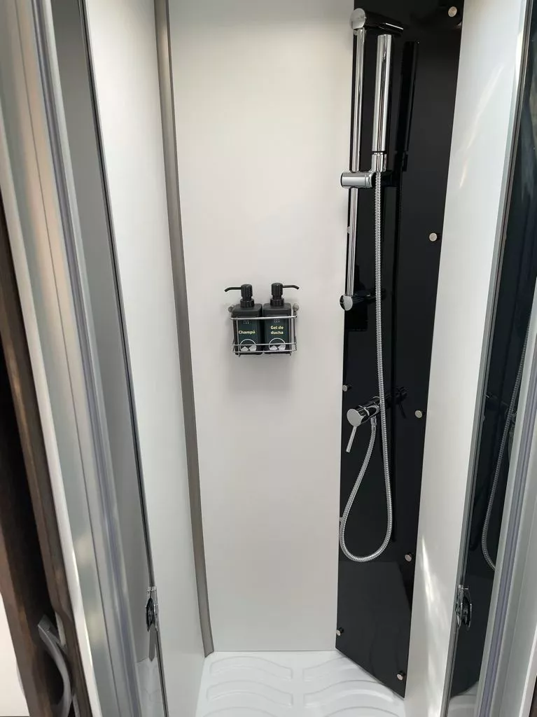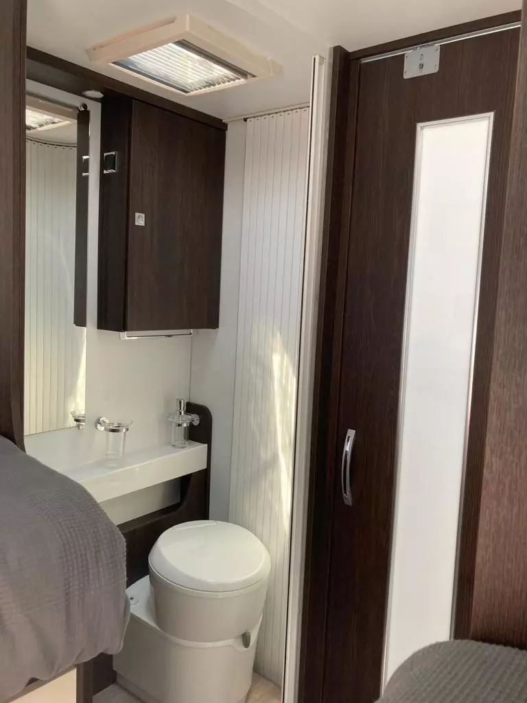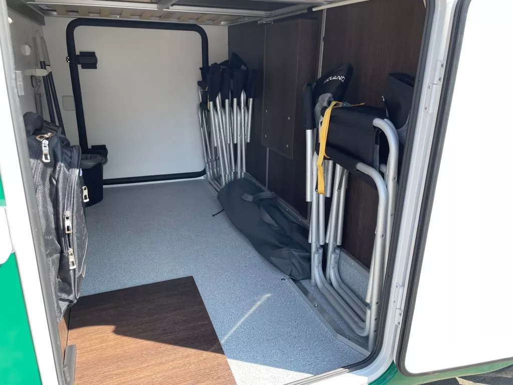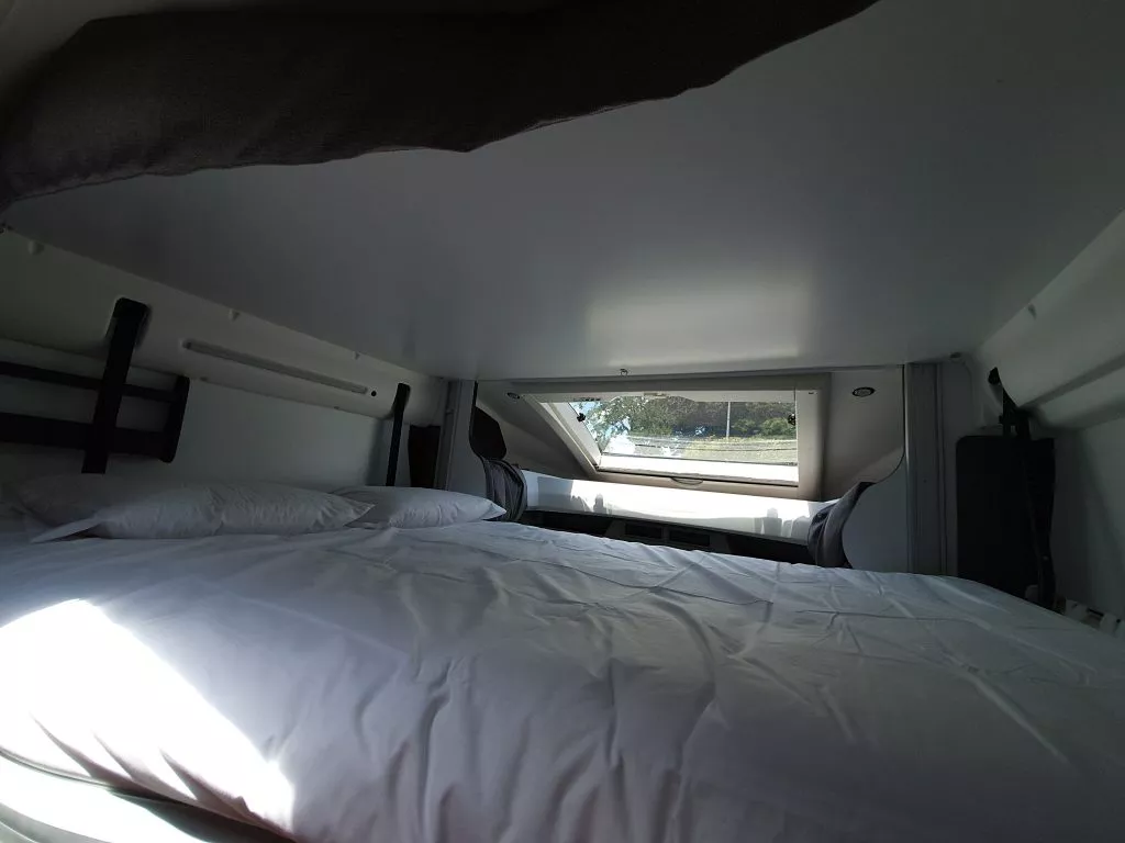 En la parte central de esta autocaravana tienes una cama doble suspendida de techo de 140/120×191 cm y comedor convertible en una cama de 90×210 cm. Además, este vehículo está equipado con cocina de 3 fuegos, nevera de 140l y fregadero, salón de 5 plazas con mesa central extensible y asientos de cabina giratorios; televisión, toldo exterior y amplio garaje con doble portón y altura máxima interior de 113 cm.