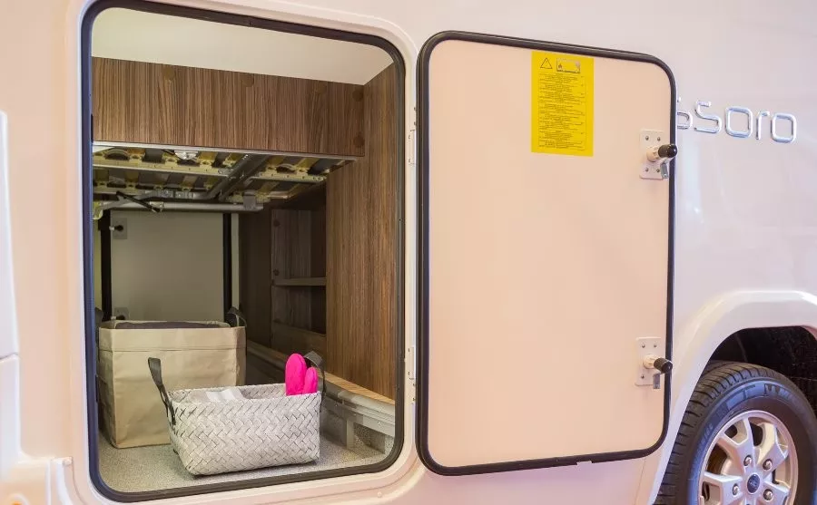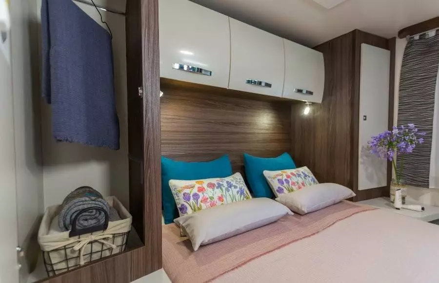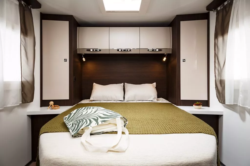 La autocaravana perfilada Benimar Tessoro 495 UP te ofrece hasta 4 plazas para viajar y 4 para dormir. Dispones de un dormitorio en la parte posterior que se separa con una puerta del resto de habitáculo. La cama doble en isla tiene unas dimensiones de 140×190 cm y la otra cama doble eléctrica suspendida del techo tiene 140×191 cm. Es un modelo de autocaravana ideal para una familia con niños o un grupo de amigos.