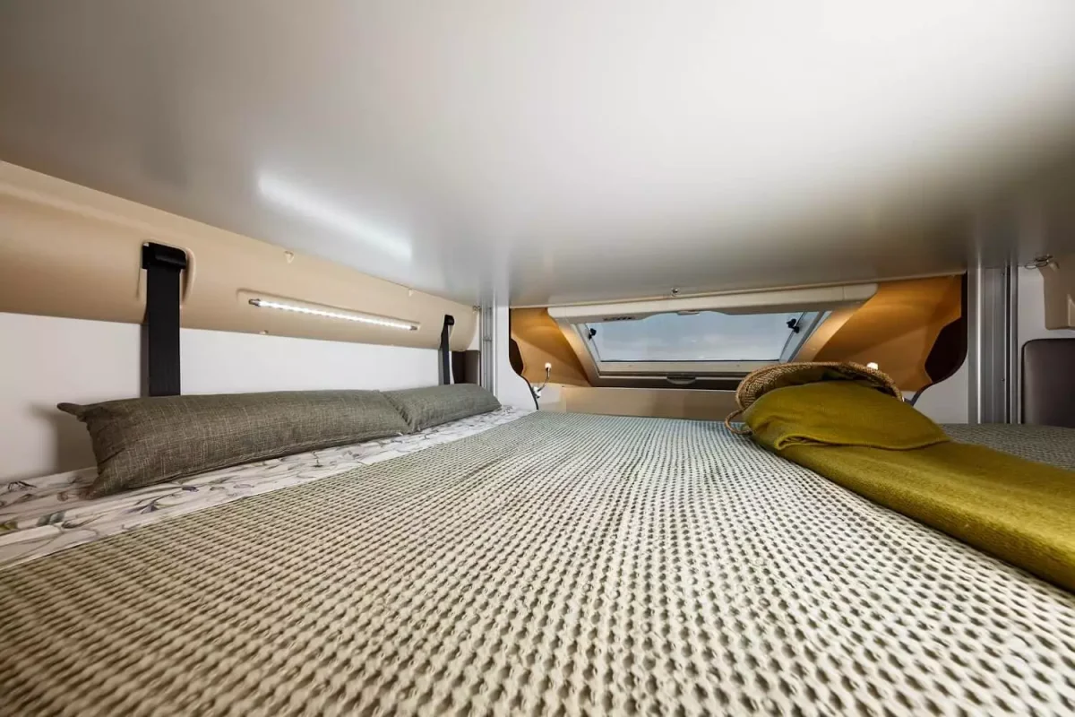 La autocaravana perfilada Benimar Tessoro 495 Up te ofrece un dormitorio independiente con cama doble en isla (140x195cm) desplazable y con cabecera reclinable. Además, dispones de otras dos camas en la parte central del habitáculo: una doble suspendida del techo de 140/120×191 y salón convertible en una cama individual de 90x210cm.