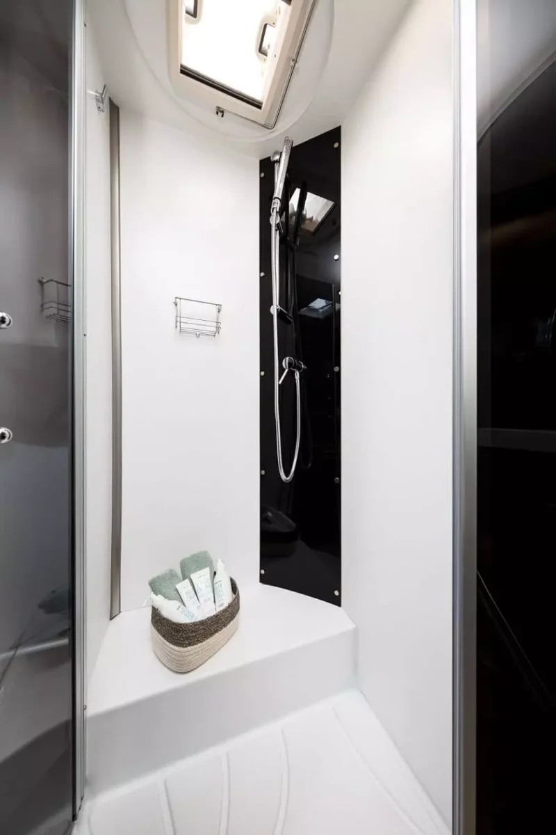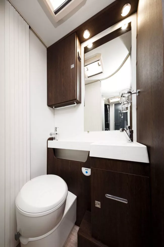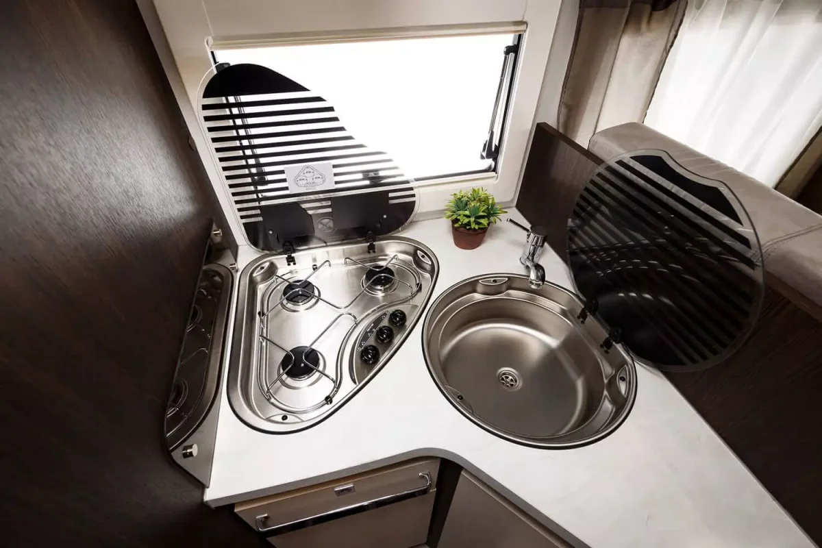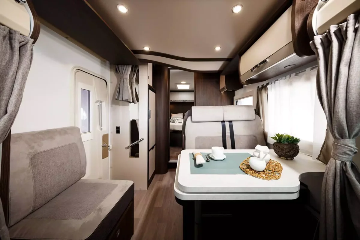 La cocina en forma de L tiene 3 fuegos encastrados, fregadero, varios espacios de almacenamiento y, aparte, tienes un frigorífico de 140l con congelador. El plato de ducha es independiente del cuarto de aseo con WC y lavabo. La mesa del comedor es ampliable y los asientos del conductor y copiloto son giratorios.