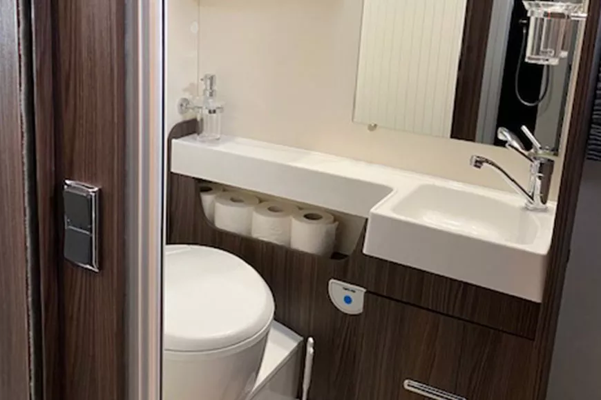 Además, este modelo te ofrece un cuarto de aseo completo con ducha independiente, cocina con fregadero, 3 fuegos encastrados con encendido eléctrico, microondas, gran nevera de 140l y set de vajilla. El salón es en forma de “L” con mesa regulable y posibilidad de girar los asientos del conductor y copiloto.