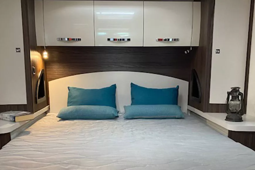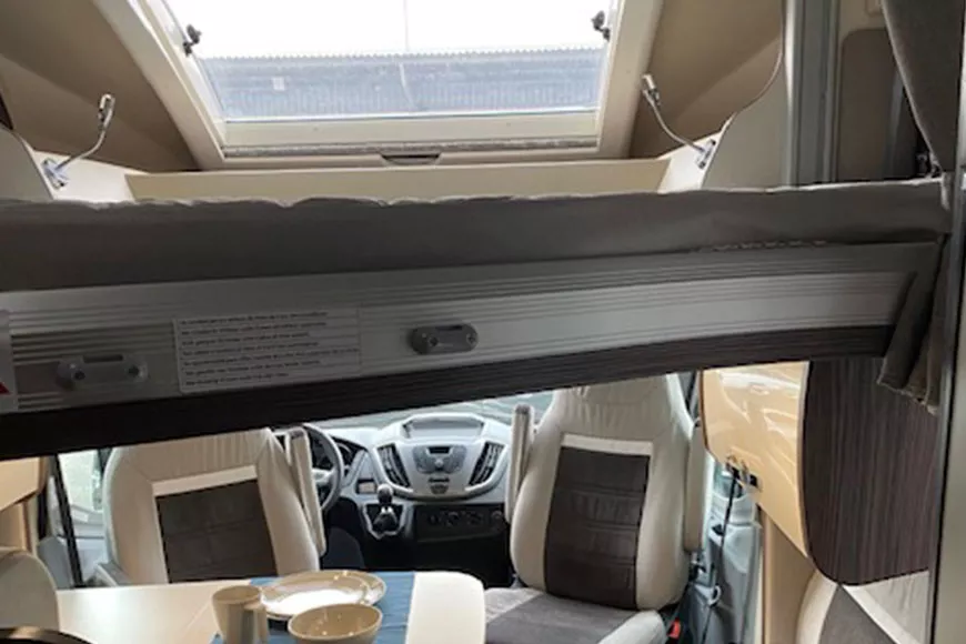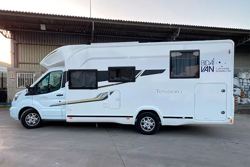 La autocaravana perfilada Benimar Tessoro 496 es un modelo con 5 asientos homologados para viajar y 5 plazas para dormir. En la parte posterior se encuentra el dormitorio con una puerta de separación, cama doble en isla de 150×195 cm y armarios roperos. En la parte central tienes una cama doble suspendida de techo eléctrica con unas dimensiones de 140/97×191 cm. La zona del salón se transforma en una cama individual de 90×210 cm.