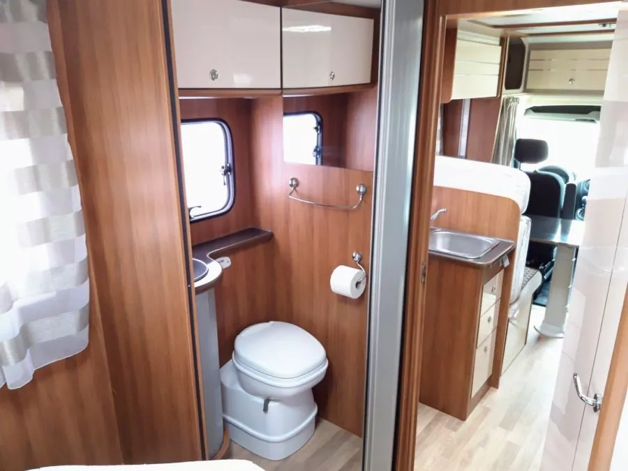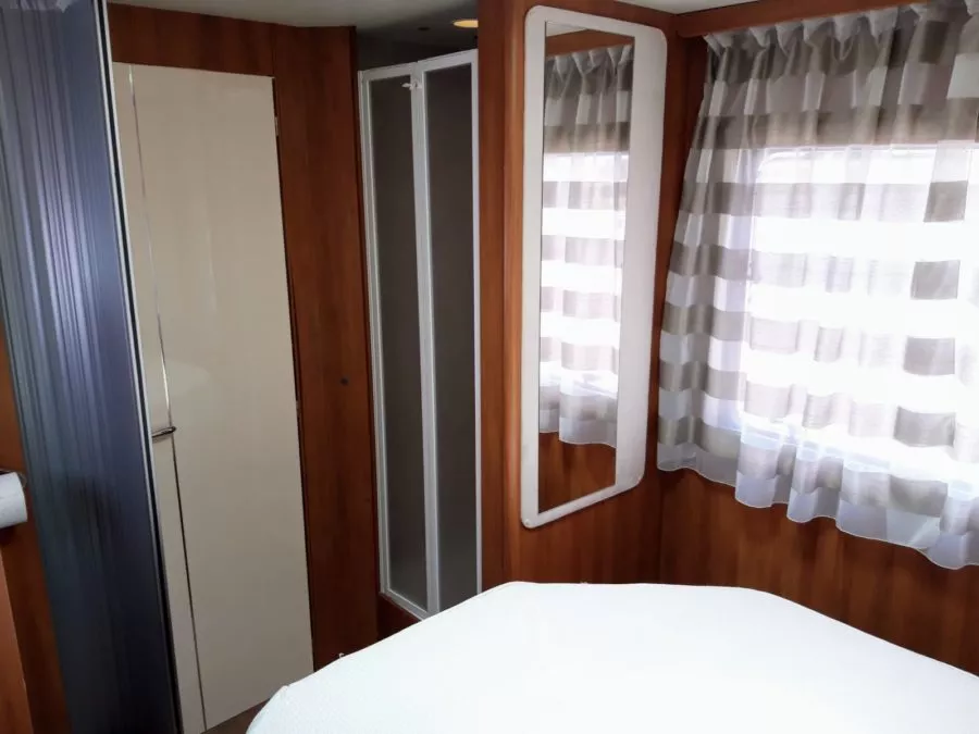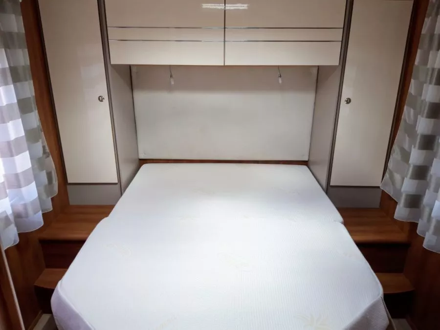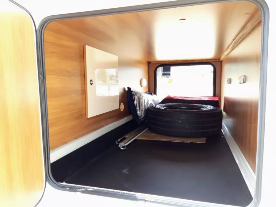 En la parte central del habitáculo dispones de un amplio comedor, cocina de tres fuegos, frigorífico, fregadero, varios espacios de almacenamiento y una cama doble eléctrica basculante de 123×200 cm.