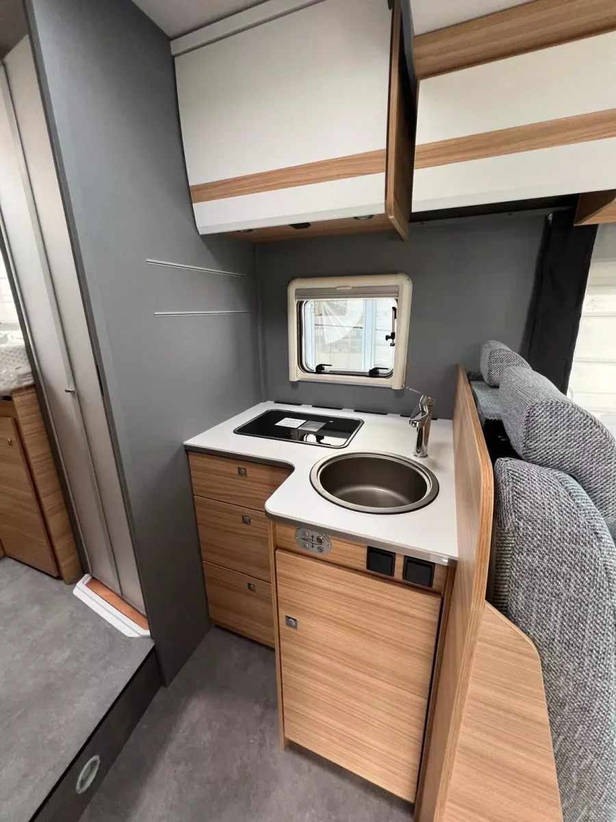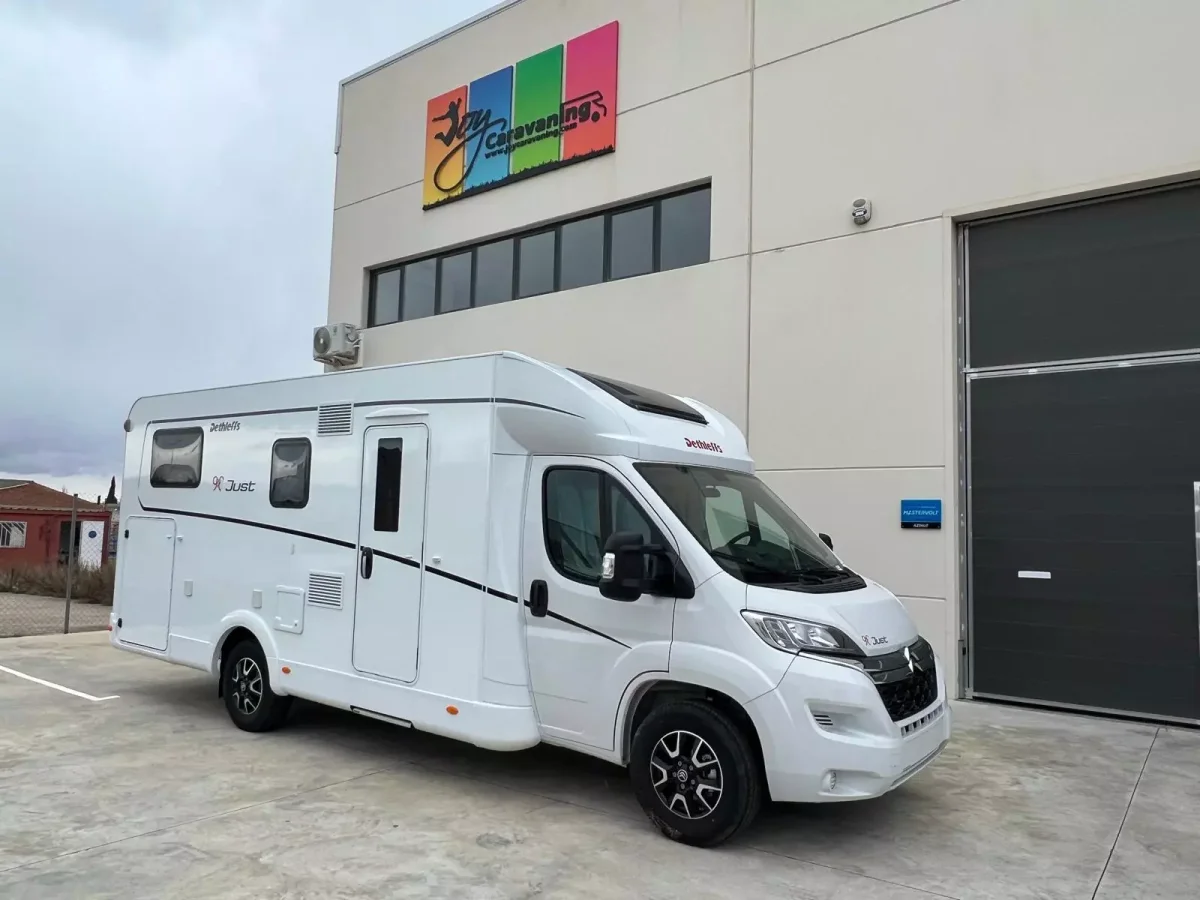 La autocaravana perfilada DETHLEFFS JUST 7052 EB es un amplio vehículo que te ofrece hasta 5 plazas para viajar y para dormir. Dispones de 2 camas gemelas en la parte posterior del habitáculo que se convierten en una gran cama de 210×190 cm. También tienes otra cama doble de 200×140 cm abatible sobre el comedor.