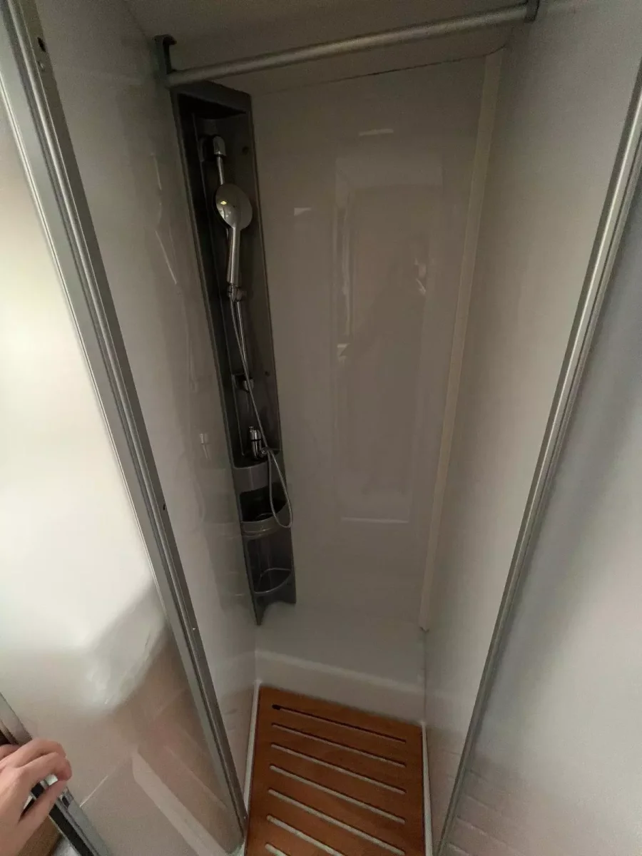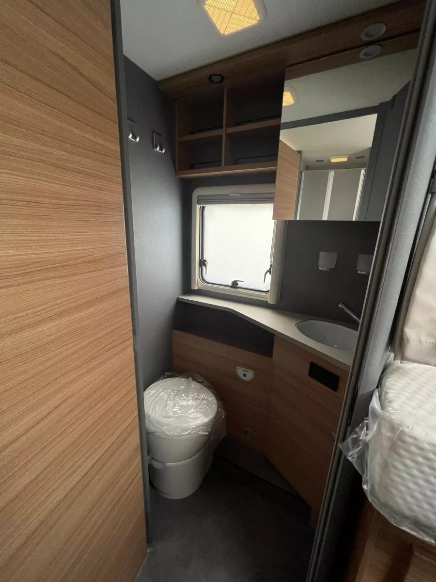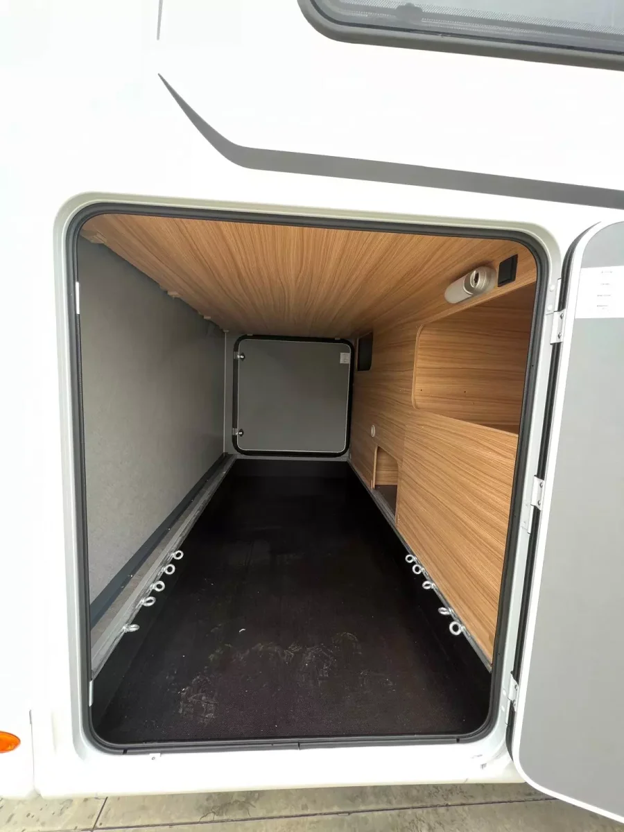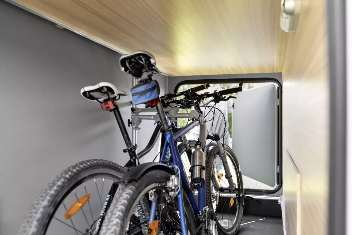 Además, esta autocaravana está equipada con un cuarto de aseo con WC y lavabo, plato de ducha independiente, agua caliente, calefacción, aire acondicionado en el habitáculo, cocina de tres fuegos, nevera con congelador, fregadero, amplio salón con televisión y asientos de cabina giratorios, gran garaje con doble portón, toldo exterior y portabicicletas para 4 bicis.