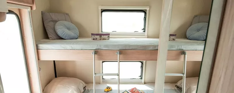 La autocaravana capuchina Giottiline Siena 435 es un modelo familiar con tan sólo 6,99 m de largo. Esta autocaravana te ofrece la siguiente distribución de camas: 2 literas (200×79 cm/219×79 cm) en la parte posterior, cama capuchina de 213×153 cm y salón convertible en dos camas, una doble y otra individual.