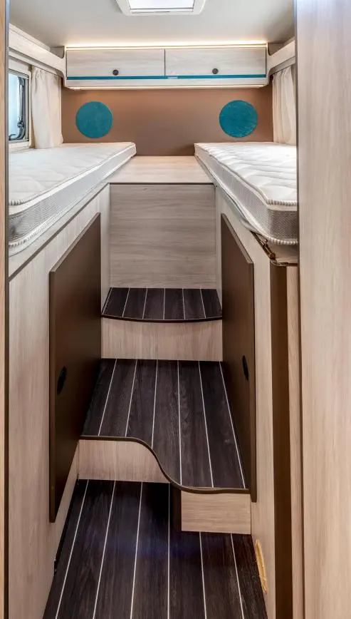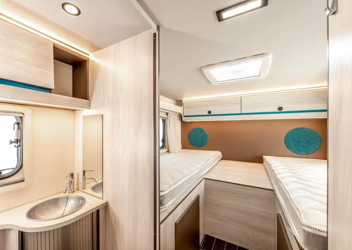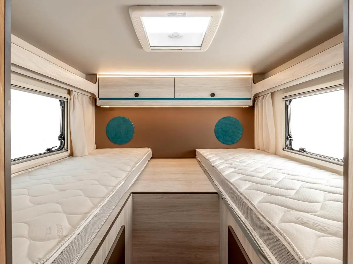 La autocaravana perfilada Rimor Kilig 95 Plus es un confortable modelo de 5 plazas. Dispones de un dormitorio separado con camas gemelas que pueden convertirse en una gran cama triple de 160×200 cm. En la zona central de habitáculo tienes una cama doble abatible sobre el comedor.