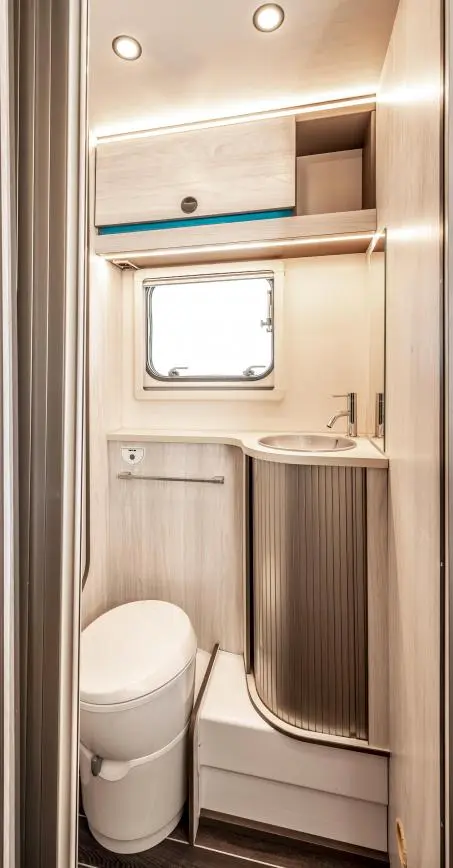Además, esta autocaravana te ofrece con un cuarto de baño con WC y lavabo, plato de ducha independiente, agua caliente, calefacción, aire acondicionado en el habitáculo, cocina completa con gran nevera de 140l, zona del comedor con asientos de cabina giratorios, amplio garaje y toldo exterior.