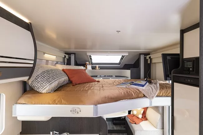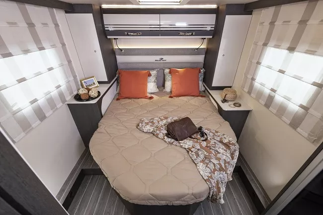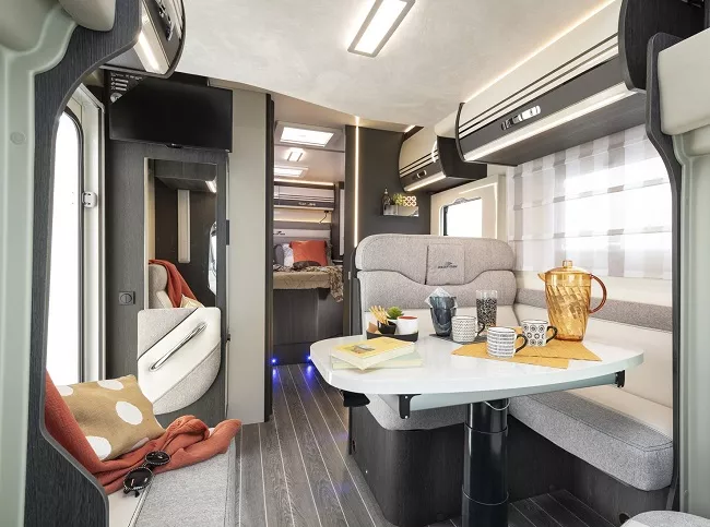 Nuestra Kronos 265Tl Es una autocaravana perfilada para dormir 4 y viajar hasta 5 personas. Su diseño sofisticado y funcional te ayudarán a disfrutar de tus vacaciones. La parte de noche se puede convertir en suite donde os sentiréis como en el mejor de los hoteles con su gran cama central en isla.