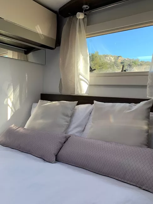 La autocaravana perfilada Benimar Tessoro 442 es un confortable modelo que te ofrece hasta 4 plazas en circulación y 4 plazas para dormir. En la parte posterior del habitáculo tienes una cama doble transversal de 138/125×198 cm. En la zona central dispones de otra cama doble abatible de techo de 140/120×191 cm y salón convertible en una cama individual de 90×210 cm.