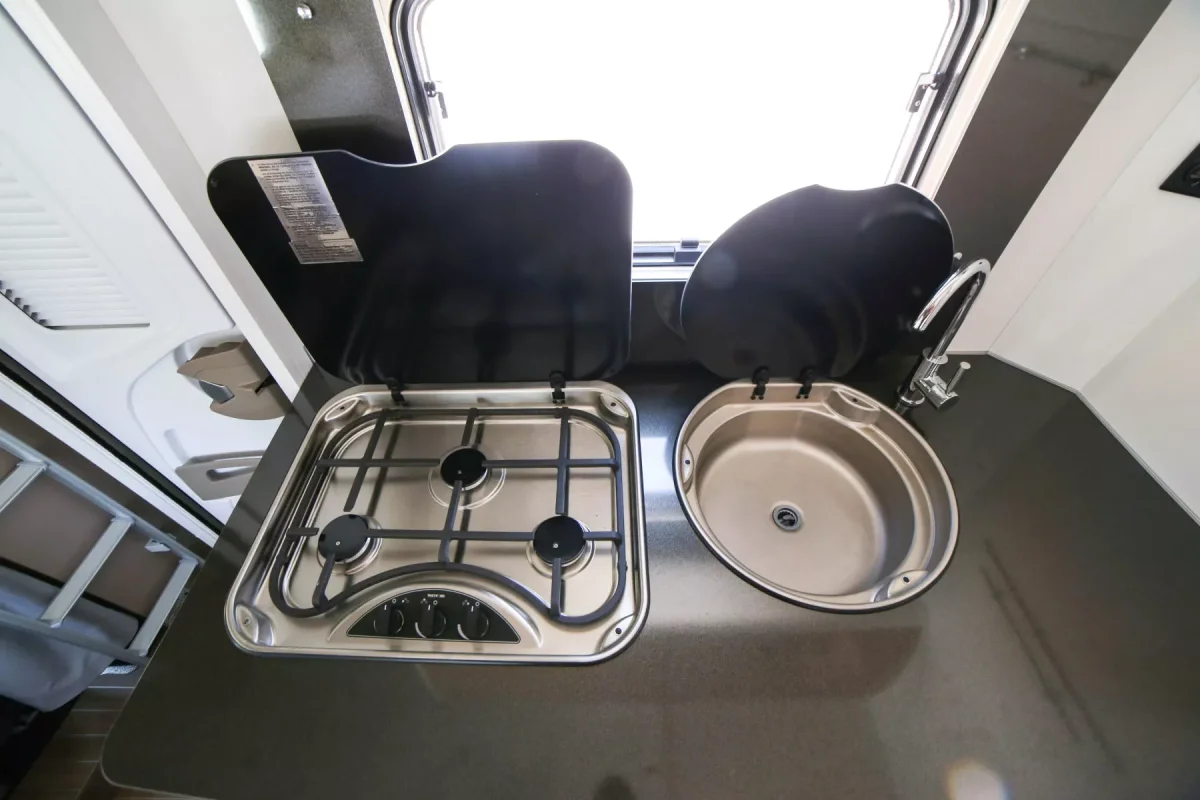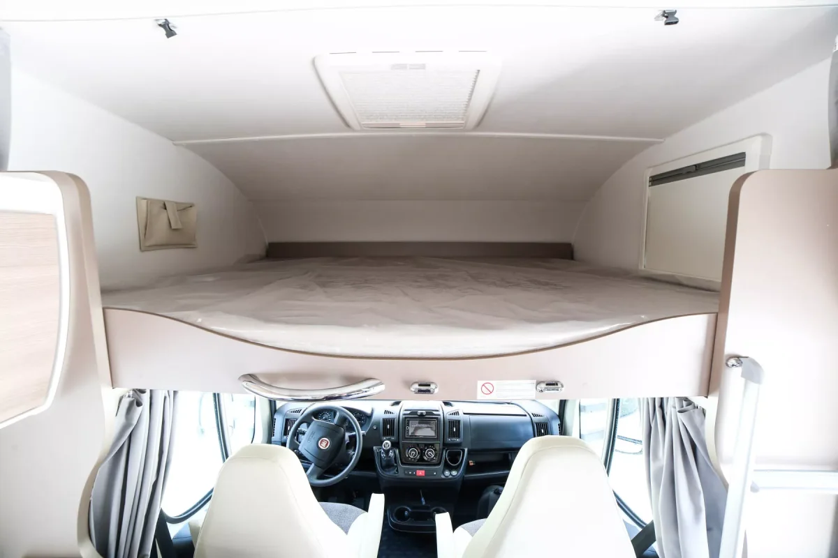 El habitáculo está compuesto por un salón para 4 personas, zona de cocina con tres fuegos a gas, un fregadero, nevera grande. En la parte trasera se encuentran dos camas individuales transversales maximizando el espacio y una gran cama doble en la parte de capuchina. Tiene ducha interior con agua caliente separada del lavabo y wc.