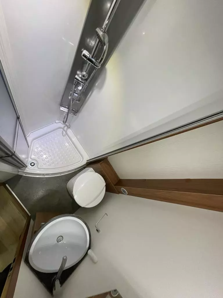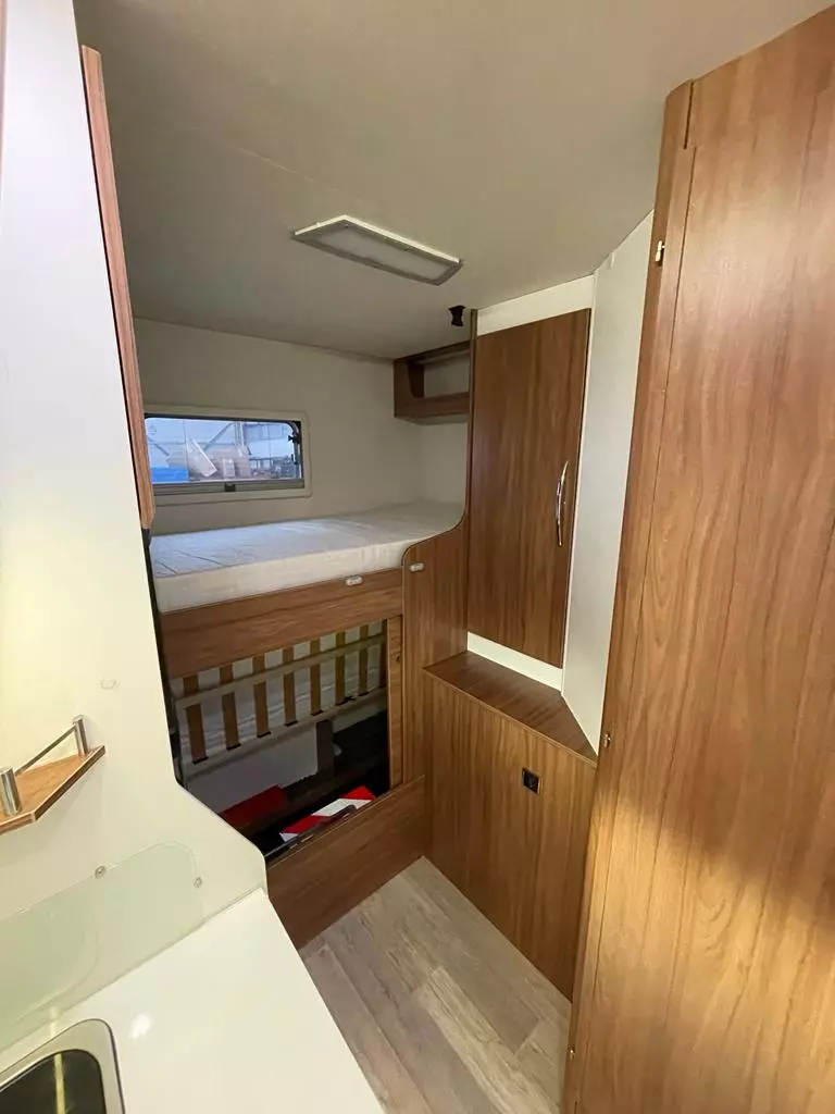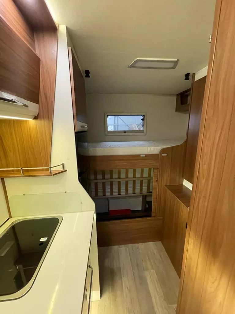 Dispone de 2 camas en litera en la parte trasera, 1 cama de matrimonio encima de la cabina y 1 cama matrimonial en el comedor.
