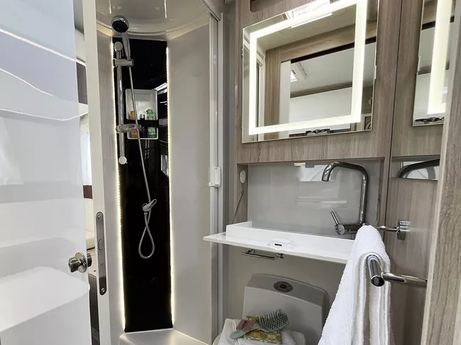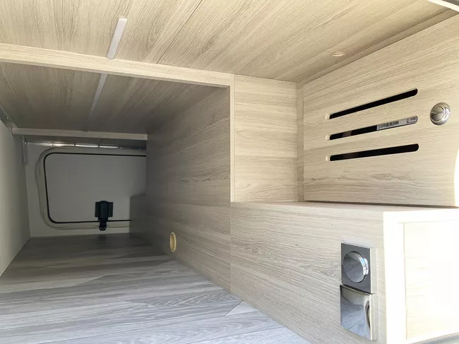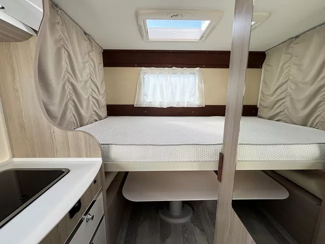La autocaravana 590FT H Premium es única en el mercado. Sorprende gracias a su gran aprovechamiento del espacio en su interior, principalmente en la parte delantera, donde dispone de un armario ropero alto y un botellero junto a un espacio de almacenamiento. En la parte trasera se encuentra un espacioso comedor convertible en una gran cama doble, así como una amplia cama de matrimonio elevable.