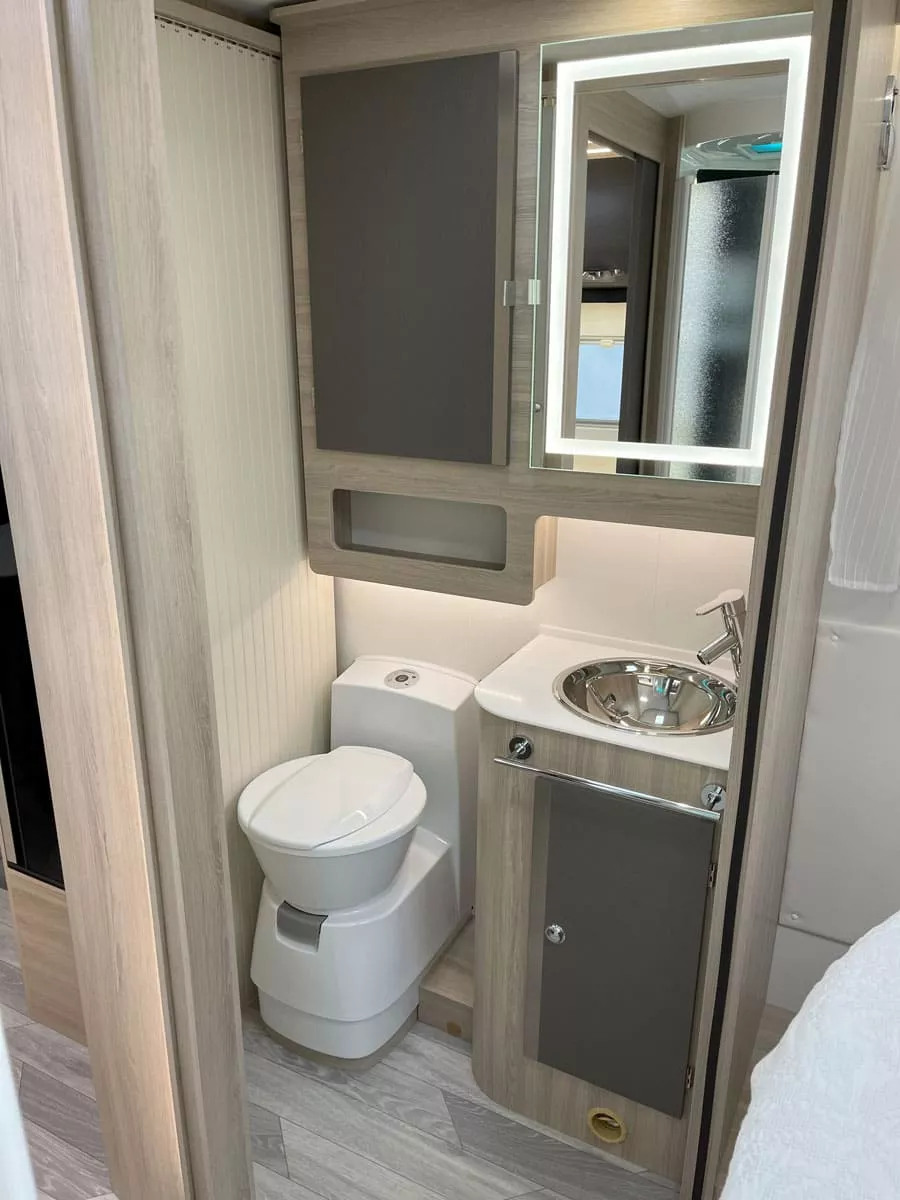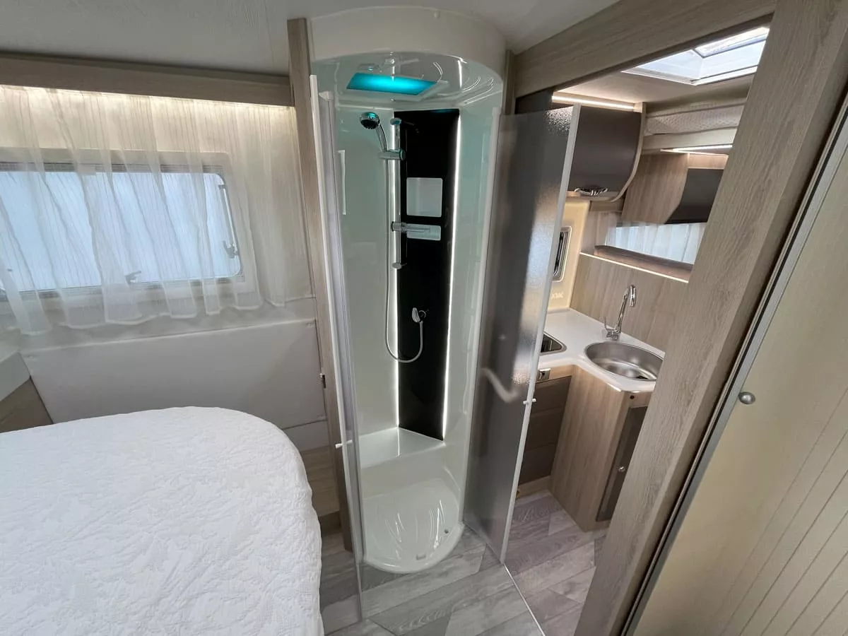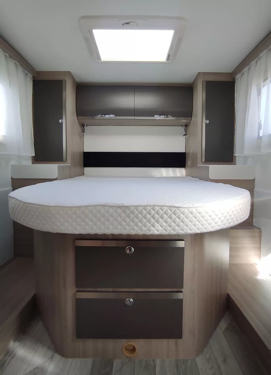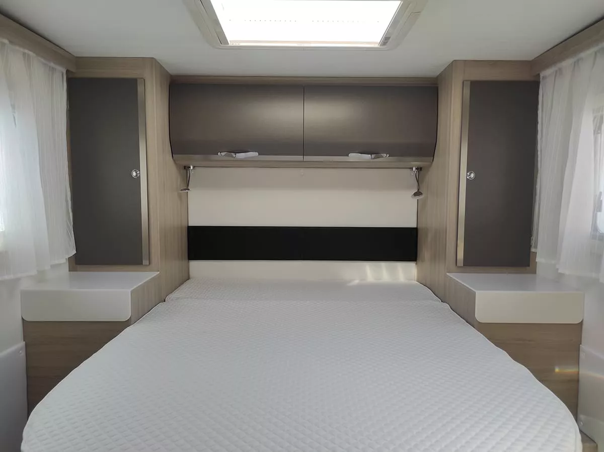 La autocaravana 730 Premium es un vehículo semi-integral con distribución clásica. Uno de los vehículos más confortables del mercado gracias a su amplio espacio en la zona dormitorio, con una cama central espaciosa fácilmente accesible por ambos lados. Gracias a la separación de la ducha y el baño, y del espacioso vestidor dividido del resto del habitáculo, permite conseguir dos espacios independientes: zona comedor y cocina, y zona dormitorio. Además, dispone de la opción de habilitar una cama elevable para familias o grupo de amigos numerosos.