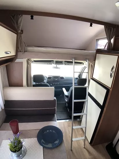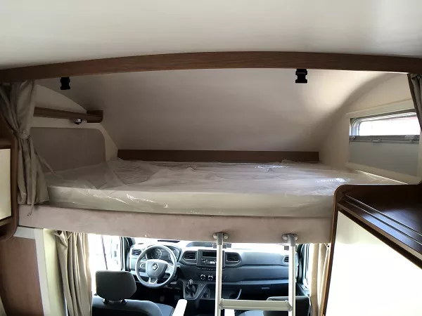 La autocaravana capuchina Rimor Kayak 5 te ofrece hasta 6 plazas para viajar y 6 para dormir. Dispones de tres camas dobles: una transversal en la parte trasera de 135×210, una capuchina de 150×220 y salón transformable en una cama de 125×181 cm.
