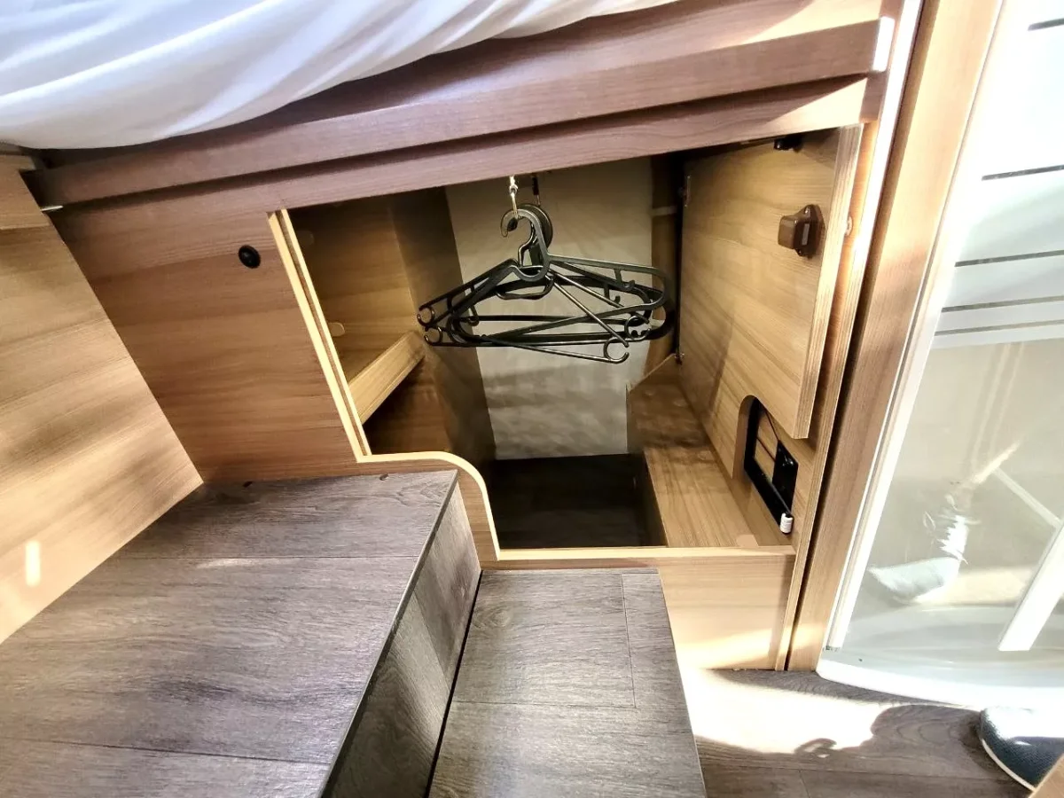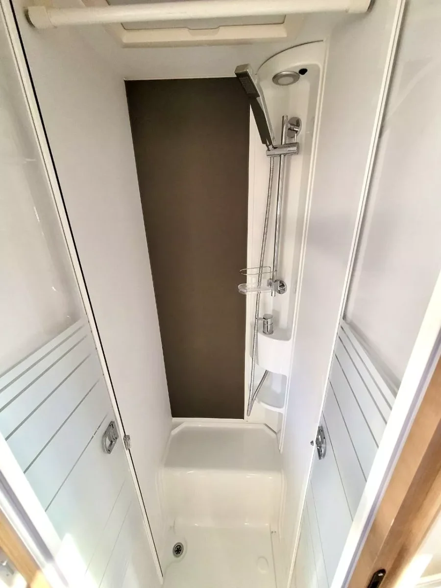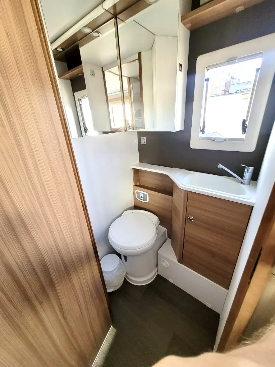 Tiene baño separado de la ducha, nevera grande trivalente (gas, 12v y 220v). Fuegos, calefacción y agua caliente a gas. Lleva inversor de corriente en la zona del salón, toldo, porta bicis, tv con antena.
