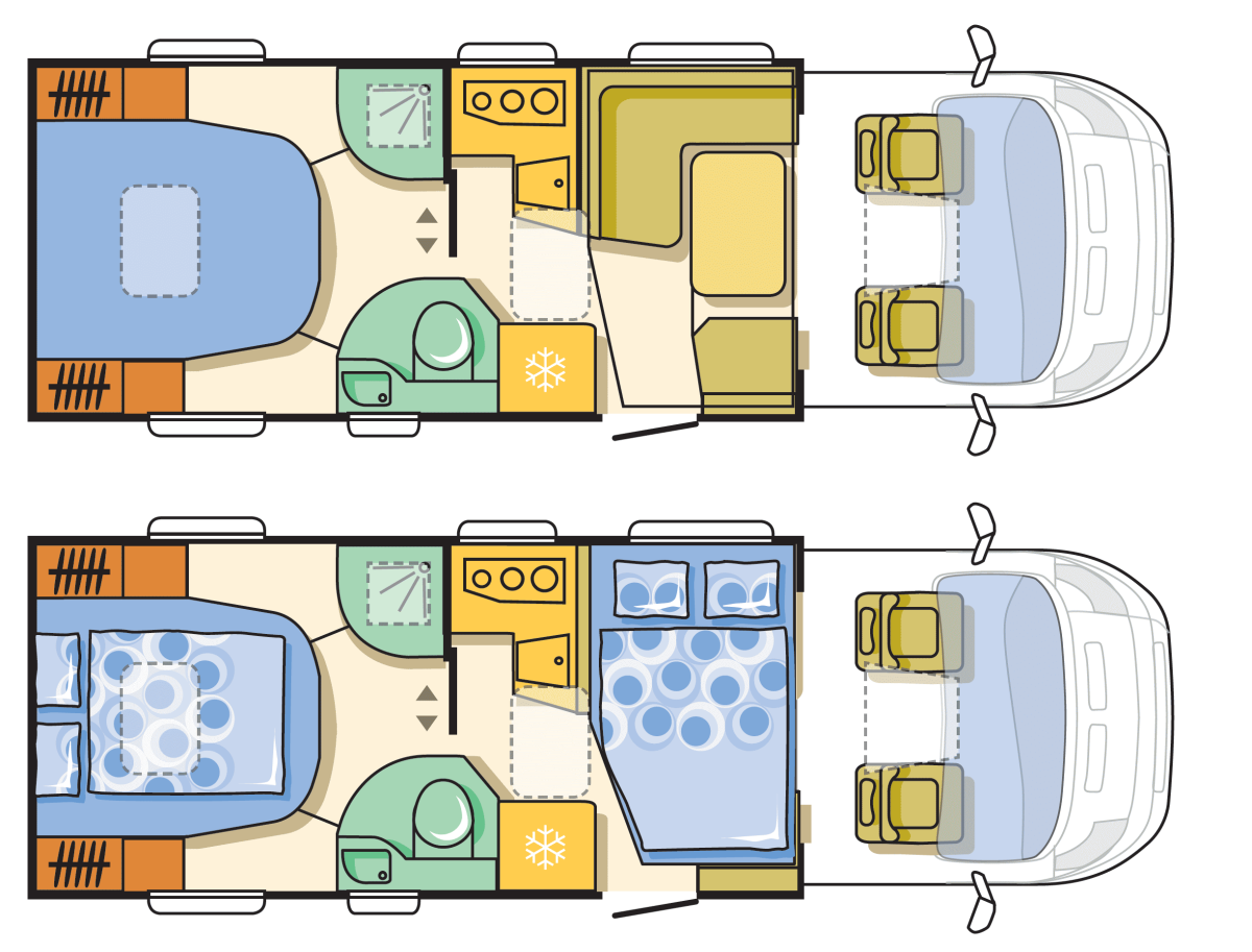 Tipo de camas: cama isla trasera (150×195 cm) y cama basculante cabina zona salón (120×195 cm)