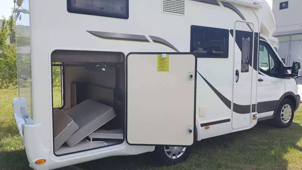 Pack extras versión UP: Toldo exterior, panel solar 110w, antena y tv, sensores de aparcamiento traseros, Batería, manguera agua)