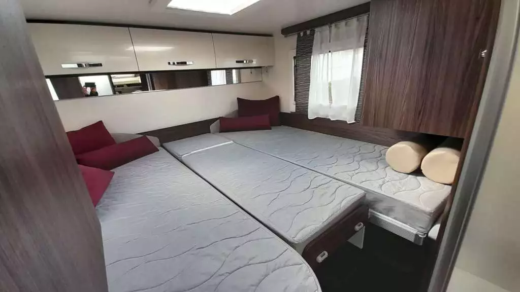 Camas de 90×210 cm(Comedor), 85×188 + 85×190 cm(Trasera) y 140/120×191 cm(Suspendida del techo).