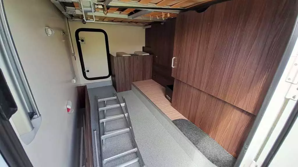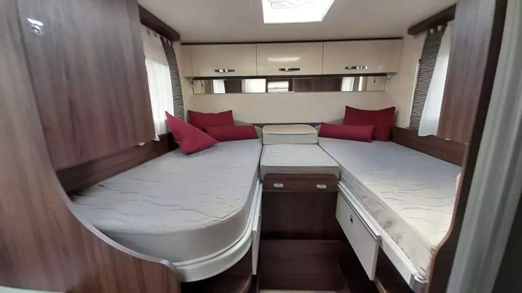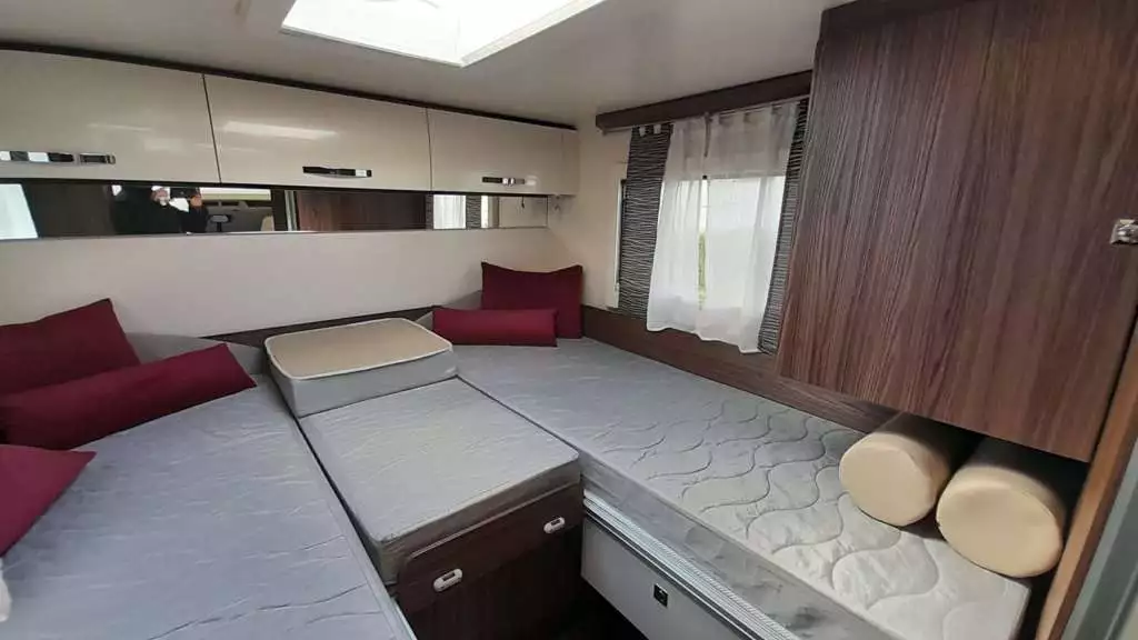 Camas de 90×210 cm(Comedor), 85×188 + 85×190 cm(Trasera) y 140/120×191 cm(Suspendida del techo).