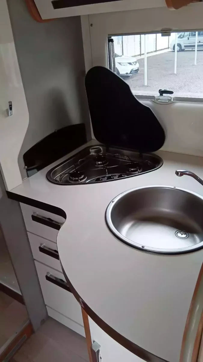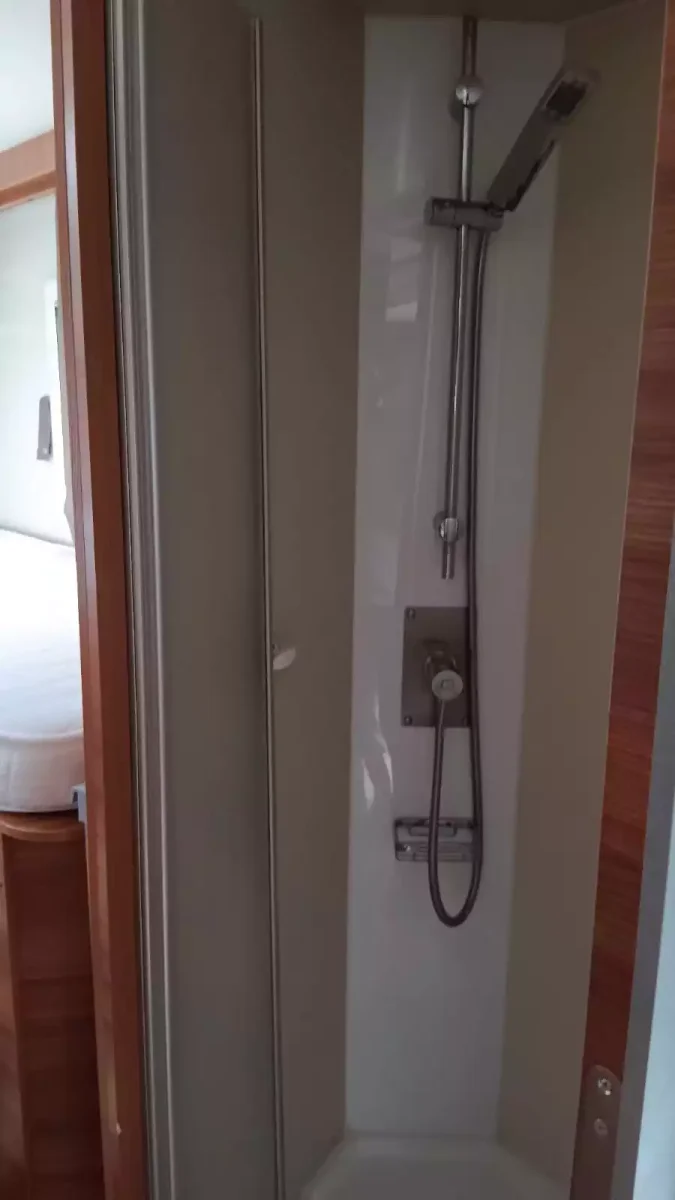 Además, tienes aire acondicionado Dometic Freshjet en habitáculo, un cuarto de baño con ducha separada; cocina completa con gran nevera de 140 l y congelador; amplio salón de 5 plazas con asientos de cabina giratorios; 1 televisión, armarios roperos, espacioso garaje, placa solar, inversor 220V.