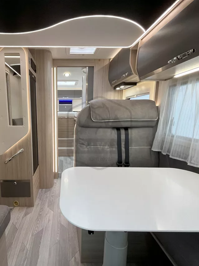 - Amplio salón comedor delantero con asientos de cabina giratorios y mesa deslizante con regulación en altura