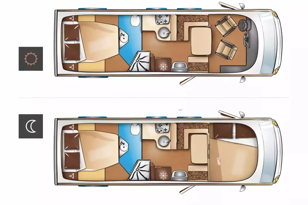 Tipo de camas: cama isla trasera (160×195 cm) y cama basculante cabina (140×190 cm)