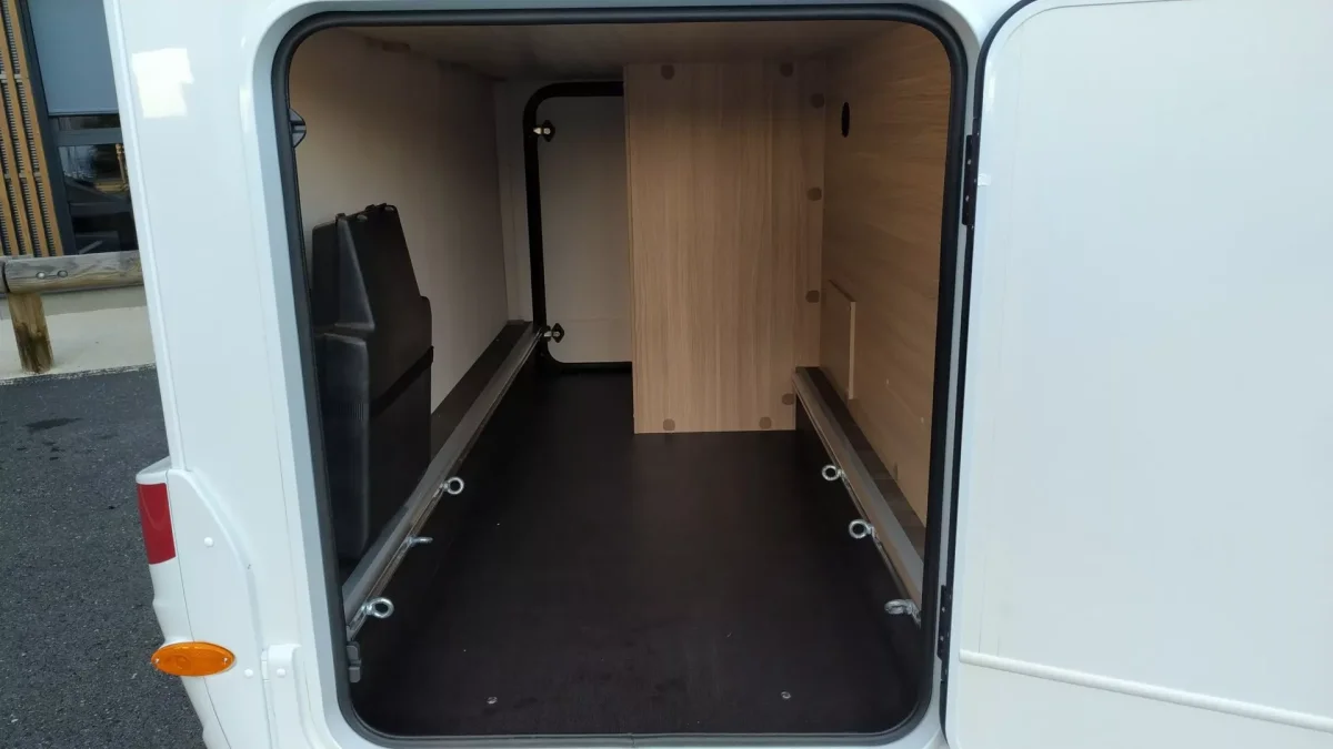 Cama trasera en isla y cama doble sobre salón elevable, gran maletero, inodoro y ducha separados.