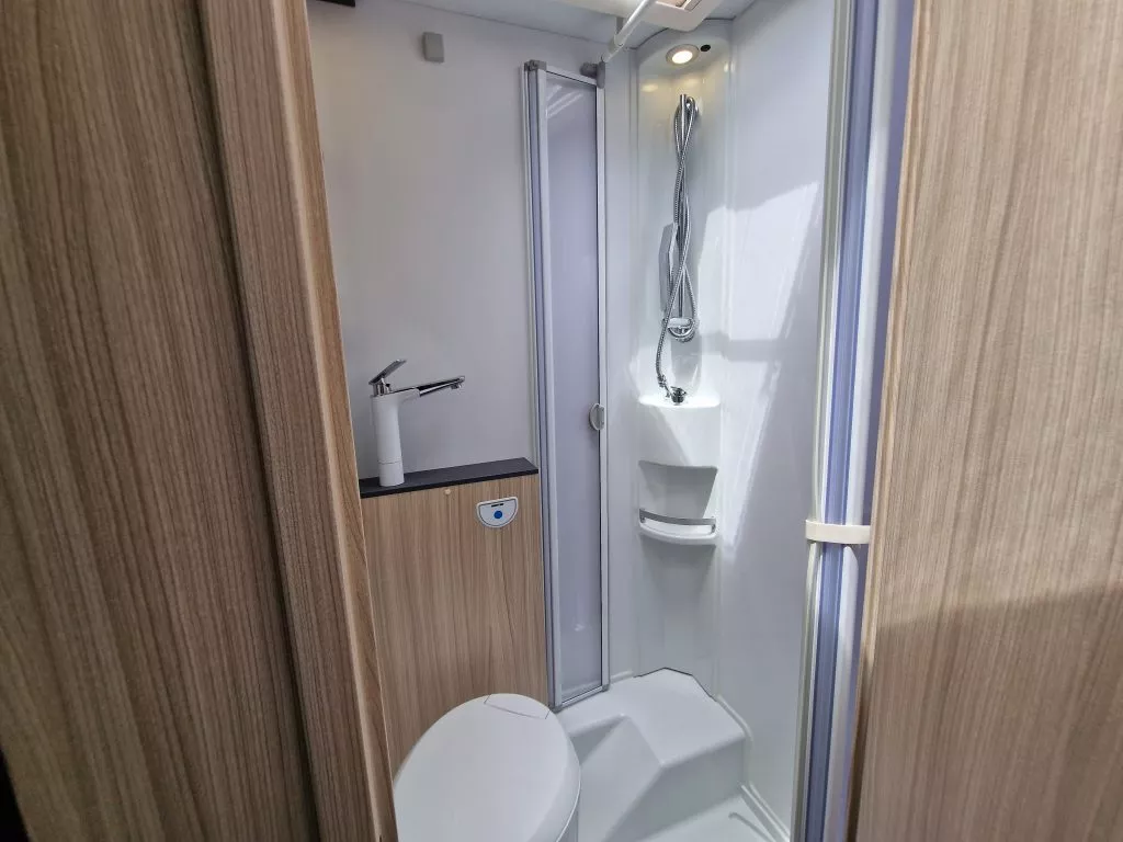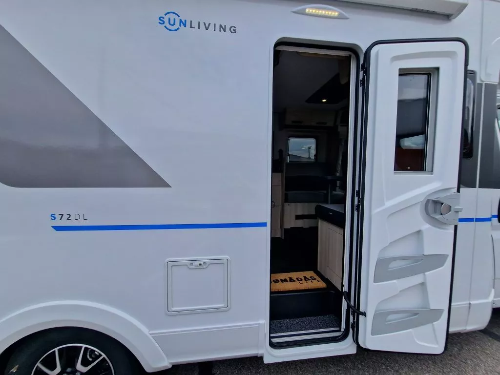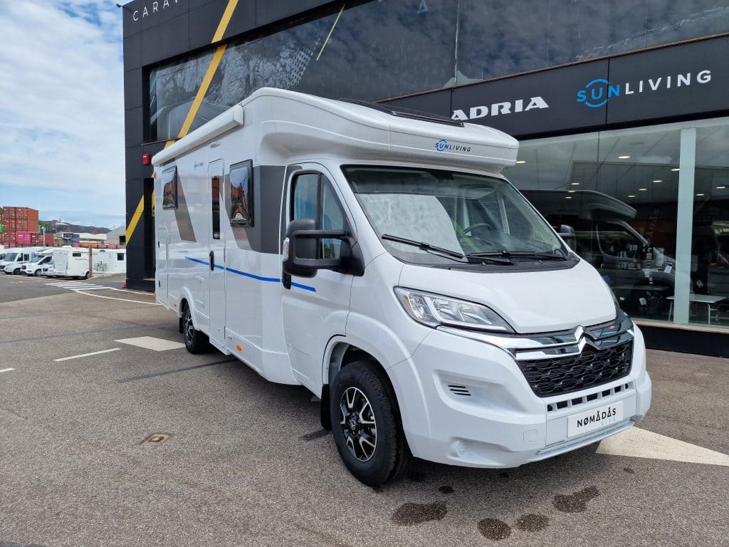 Autocaravana Sunliving S72DL modelo 2023. Salón comedor Face to Face, cocina con tres fuegos, amplio fregadero y frigorífico de gran capacidad. Baño con ducha con mampara incorporada, cama trasera gemela y cama abatible delantera. Homologada para 4 plazas. Financiamos el 100% de la compra.