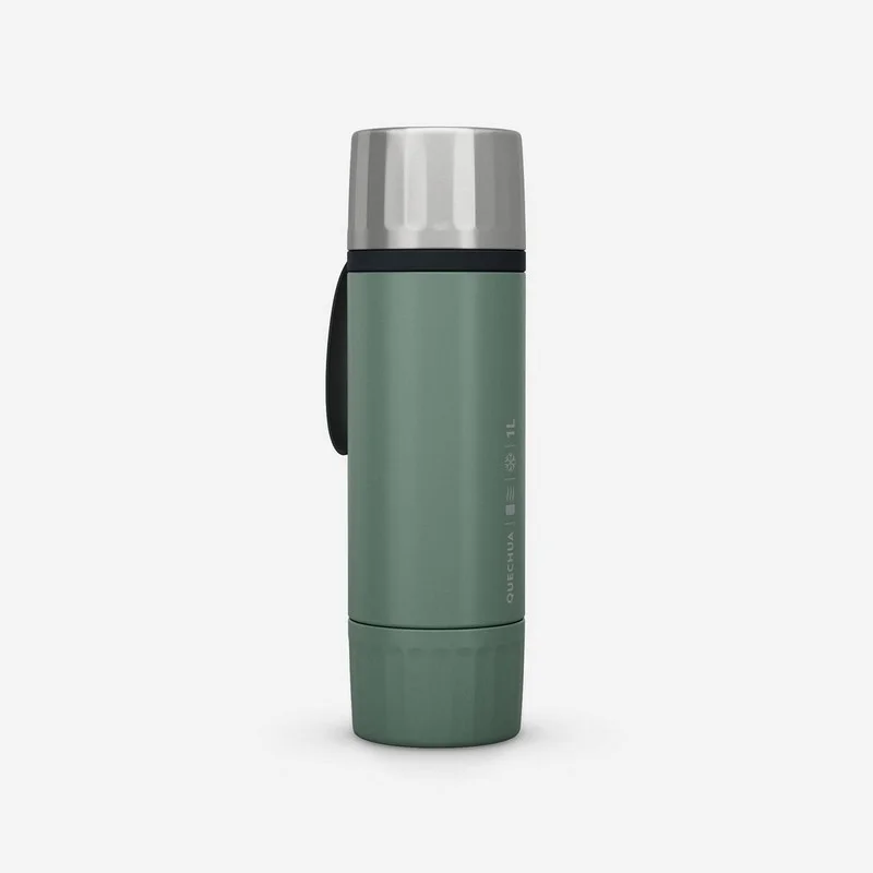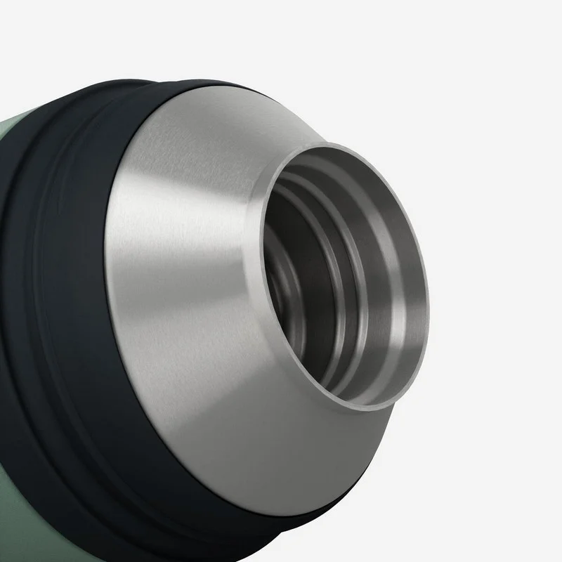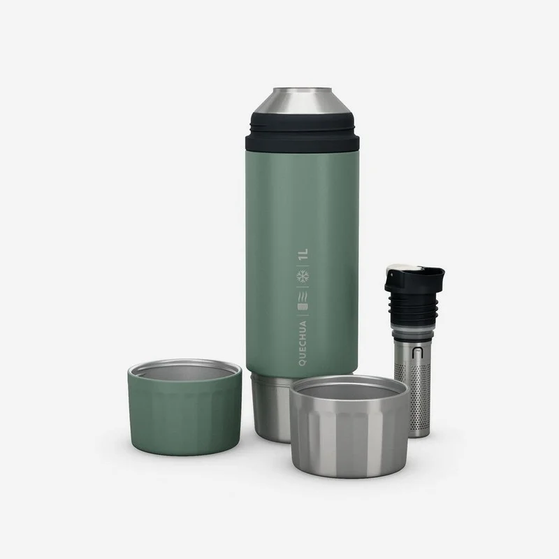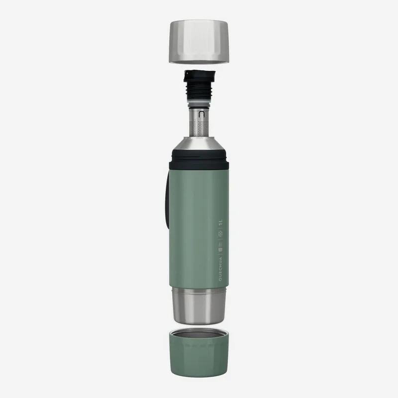 La botella cuenta con un tapón de apertura rápida que se maneja con una sola mano, un filtro de té extraíble integrado en el tapón para mayor practicidad y un vaso de acero inoxidable de doble pared que se enrosca en la botella, garantizando comodidad y un transporte seguro.
