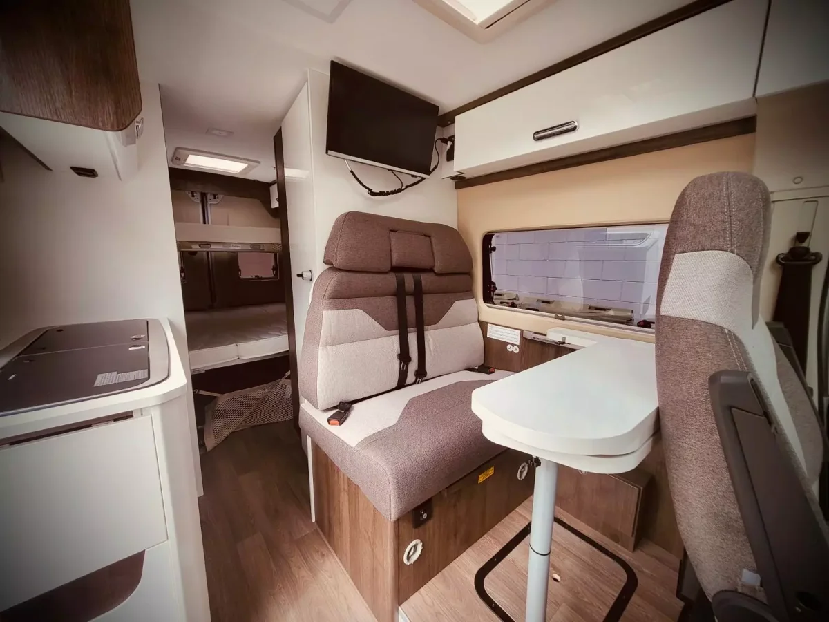 Además, tienes un cuarto de baño con plato de ducha; cocina con nevera y congelador; salón de 4 plazas con asientos de cabina giratorios; televisión, armarios y toldo exterior.